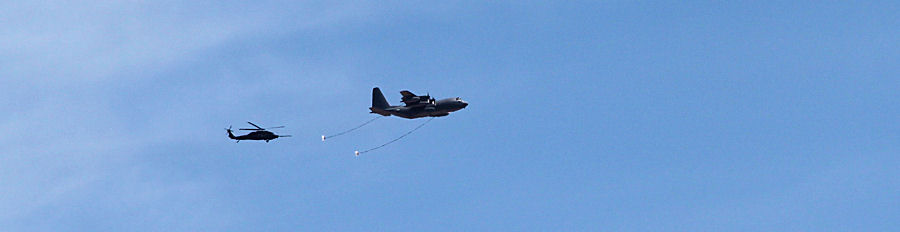 Haben wir am Father Crowley-Point vergeblich auf ein spektakuläres Manöver der Airforce gewartet, erleben wir ein für uns ebenso ungewöhnliches Ereignis: Über uns fliegen im geringen Abstand eine großes Flugzeug und ein Hubschrauber. Erst beim genauen Beobachten stellen wir fest, dass die beiden Maschinen zeitweise miteinander verbunden sind. Der Hubschrauber wird - wenn wir uns nicht täuschen - von dem Flugzeug im Flug betankt. Bisher kannte ich das nur von Flugzeug zu Flugzeug und ich habe eine solche Betankung bisher als unmöglich betrachtet, da mir nicht bekannt war, dass ein Flugzeug so langsam bzw. ein Hubschrauber so schnell fliegen kann, dass eine gemeinsame Geschwindigkeit möglich ist.