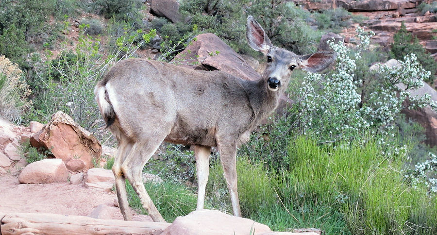Nach knapp einer Stunde erreichen wir das 3-Mile-Resthouse und haben damit 1,5 Meilen und knapp 300 Höhenmeter hinter uns gebracht. Für unsere Verhältnisse ist das eine richtig gute Zeit. Übrigens haben Anita und ich mittlerweile einen unterschiedlichen Laufrhythmus. (was aber wieder ausgeglichen wird, weil ich meist etwas längere Pausen mache) Beim Erreichen des Resthouses liegen einige Hundert Meter zwischen uns. Letztlich erreicht sie das Resthouse aber nur gute fünf Minuten nach mir. Hier sieht man, dass ein schnelleres Wandern letztlich kaum einen Zeitvorsprung bringen würde Bisher haben wir noch keinen anderen Hiker gesehen. Die einzigen Wegbegleiter um diese Tageszeit sind „Deers“, die sich kaum stören lassen, und uns auf wenige Meter an sie heranlassen. Vermutlich weil sie die Erfahrung gemacht haben, dass ein Zweibeiner, insbesondere mit so viel Gepäck, auf keinen Fall so schnell ist wie sie selbst.