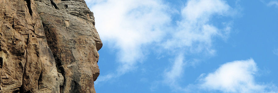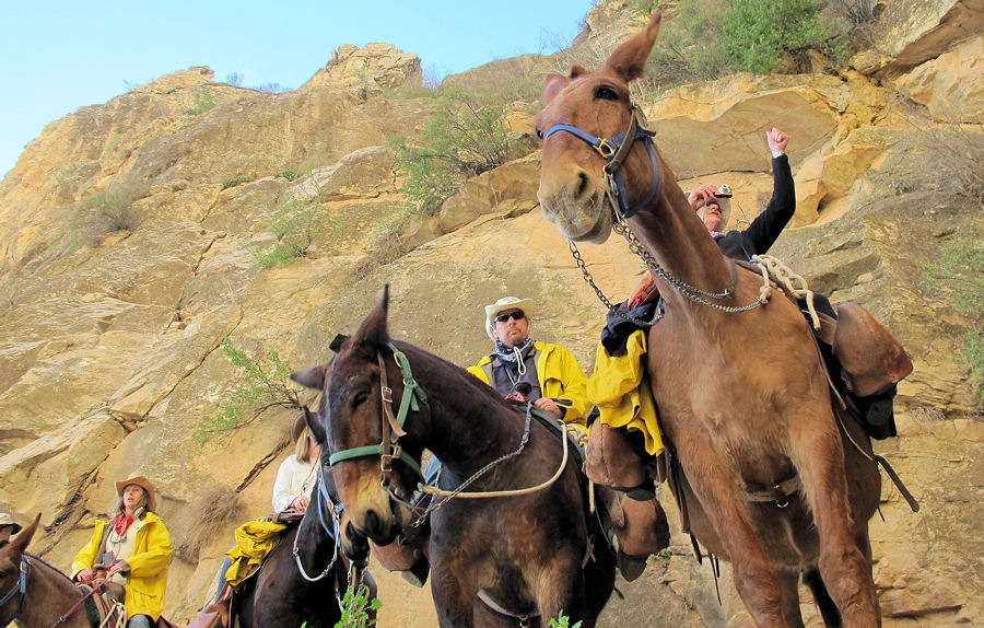 Der Guide erklärt den Touristen, wie sie die Zügel halten sollen, Besonderheiten des heutigen Trails und macht sie auch auf einen Felsvorsprung aufmerksam, der an das Gesicht eines Natives erinnert. Donnerwetter ! Wir haben schon einige Male diesen Fels passiert, aber der Native ist uns noch nie aufgefallen!