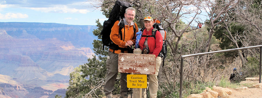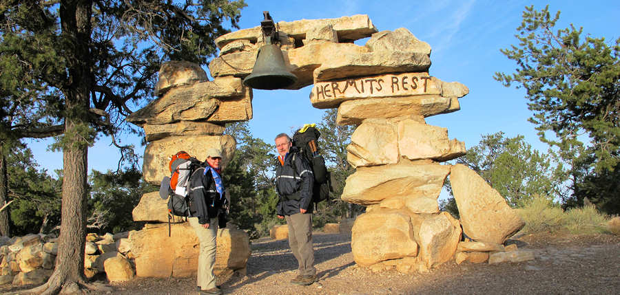 Wir parken den Wagen in der Nähe des Bright Angel Trailheads, an dem wir in fünf Tagen - so Gott will - wieder rauskommen. Mit dem Shuttle um 6:30Uhr fahren wir den West Rim Drive bis zu Hermits Rest, wobei wir die meiste Zeit allein im Bus sind, vom Fahrer selbstverständlich abgesehen. Zwischendurch schauen wir immer wieder hinab in große, für uns das schönste und atemberaubendste Loch der Welt, in den Grand Canyon. Wir albern rum, dass wir jetzt noch kneifen können und dass es doch schade ist, dass unser tolles Postauto nun fünf Tage allein rumsteht. Wir kennen keine Gnade mit uns und steigen nach knapp einer halben Stunde aus. Der Fahrer mahnt uns noch, auf jeden Fall vorsichtig zu sein, was wir ihm versprechen. Die spontane Idee, noch ein oder zwei kalte Flaschen Cola mitzunehmen (wir sahen das mal bei Amerikanern auf der Rim2Rim Tour) scheitert am Automaten, der unser Geld und seine Cola bei sich behält. So gehen wir ohne die erhoffte Soda etwa 200 Meter bis zum Trailhead, wo noch traditionsgemäß ein "Vorher-Foto" gemacht wird.