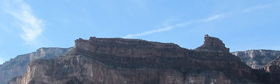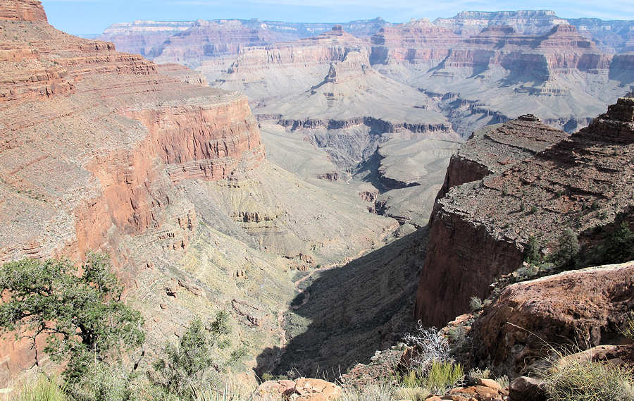 Ich verstehe einfach nicht, weshalb die Rangerin uns vorgestern sagte, das Wasser ohne Weiteres trinken zu können und dass sie selbst es regelmäßig täte. Jetzt weiß ich, weshalb sie uns so "angestrahlt" hat. Der leichte Hauch von Wolken hat sich aufgelöst. Zwar gibt es jetzt sogar einige kräftigere und vermutlich schattenspendende Wolken, aber nur über dem Northrim und nicht über uns. Aber wir wollen uns nicht beschweren. Der heutige Marsch ist wesentlich angenehmer als die der Vortage, insbesondere der des ersten Tages.