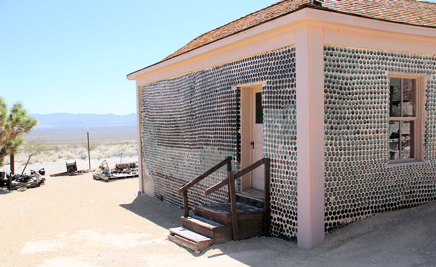 Auch das sogenannte „Bottlehouse“ ist mittlerweile von einem sicheren Zaun umgeben und hält somit aufdringliche Besucher (und leider auch mich) von allzugroßer Nähe ab. Die Wände des kuriosen Hauses wurden von einem Einsiedler nur aus Glasflaschen und Lehm gebaut. Was damals als ziemlich verrückt angesehen wurde wird erfährt heute unter ökologischen und ökonomischen Gesichtspunkten großes Interesse. Die skurrile Bauweise ermöglicht eine einzigartige Isolation gegen die sengende Hitze hier im Death Valley.