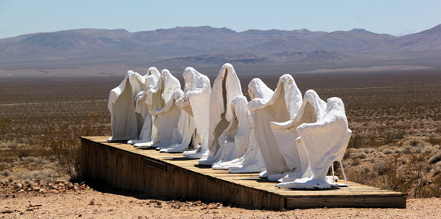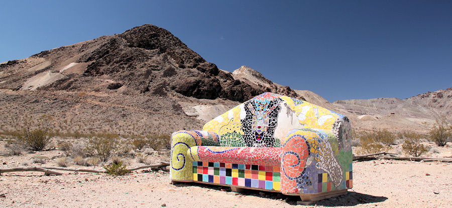 fahren wir weiter an Scottys Castle vorbei. Das haben wir vor einigen Jahren mal besucht. Zur damaligen Zeit gab es bei Stovepipe Wells immer noch ein großes Schild auf dem stand, wie lange die Wartezeit für eine Führung durch Scottys Castle ist und das Schild stand ab Vormittag stets auf 2 Stunden oder mehr. Wir haben uns damals immer gefragt, ob es ein Standardschild ist, das am Vormittag installiert und am Nachmittag abmontiert wird. Aber es hat tatsächlich auch unterschiedliche Wartezeiten angezeigt. Unklar war uns auch, wie die Kommunikation ist und wer dann zur Kreuzung von Stovepipe Wells fährt um die Schilder umzuhängen. Aber das ist lange vorbei, die Schilder gibt es nicht mehr. Wir sind damals spontan und trotz der angekündigten Wartezeit hingefahren und haben, zu unserer Überraschung, gerade mal fünf oder zehn Minuten warten müssen. Aber jetzt lassen wir das Castle links liegen und begeben uns auf neues Terrain, denn die weitere Strecke bis Beatty kennen wir noch nicht. Beatty hat sich zwischenzeitlich verändert, es gibt ein Motel 6, Denny`s und auch andere weniger erwähnenswerte Etablissements. Unser nächster Halt findet in Ryholite statt, einer Ghosttown. Unser letzter Besuch liegt schon einige Jahre zurück. Auf diesen Ort sind wir damals durch einen kleinen Artikel in der Zeitung gestoßen. Das Internet steckte damals noch in den Kinderschuhen und hatte noch andere Dinge zu berichten als über Rhylolite. Während wir in den ersten Jahren bei unseren Besuchen eine fast schon gespenstische Einsamkeit vorfanden wird es jetzt und heute von einigen Interessierten besucht. Immer wieder faszinierend ist der untere, zur Hauptstraße liegende Teil, der sich zu einer Sammlung von Skulpturen des im Jahre 2000 verstorbenen Künstlers A.Szuralski entwickelt hat. Mittlerweile gibt es ein weiteres Objekt zu sehen: Eine Couch.