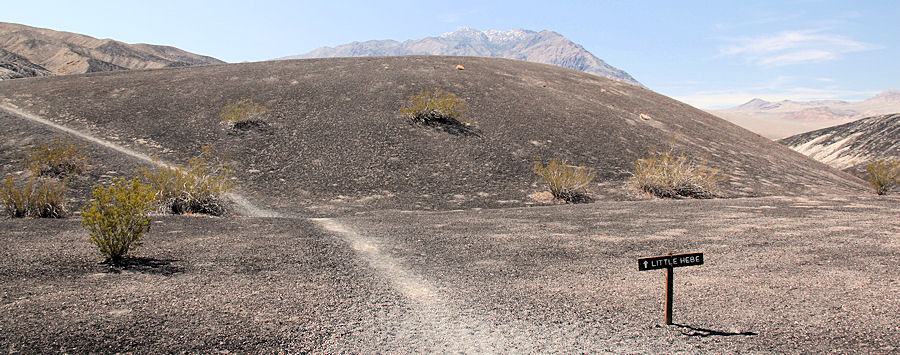 Soweit man die Formel zur Umfangberechnung noch im Kopf hat werden wir auf einen Rundweg von ca. 2,5km kommen, was sich bestätigt. Der Rundgang ist ganz nett. Wir sind ihn entgegen des Uhrzeigersinns gegangen, was den Vorteil hat, dass man den stärksten Anstieg sofort zu Beginn hat und danach nur noch ein tendenzieller Abstieg erfolgt. Nach 0,6 Meilen kann man die Loop auch beenden und statt des Rundweges auch nur den „Little Hebe“ besichtigen, einen kleinen Neben-Krater des Ubehebe-Craters.