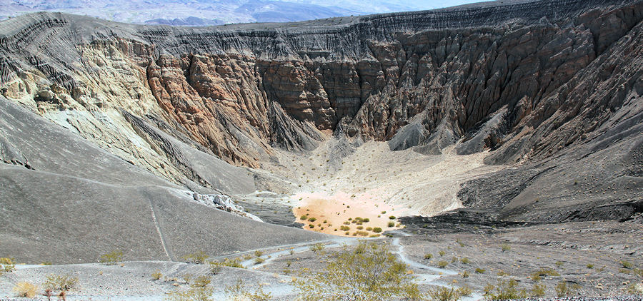 Unsere erste Station ist in der Tat der Ubehebe Crater, den wir vor vielen Jahren bereits besucht haben. Ein riesiger Krater, der durch einen Vulkanausbruch entstand, bietet sich als ein kleiner Spaziergang an. Mit einer Tiefe von ca. 200Meter liegt das große Loch vor einem und bietet einen guten Blick hinab. Es gibt keinen offiziellen Trail hinab aber mehrere Stellen am Rand lassen darauf schließen, dass es öfters Wagemutige gibt, die versuchen hinabzusteigen. Der Kraterrand ist recht steil, so dass ich mir gut vorstellen kann, dass man beim Abstieg unversehens schneller unten angelangt ist als beabsichtigt. Außerdem scheint mit der Aufstieg besonders schwierig, weil der schottrige Untergrund nachzugeben scheint