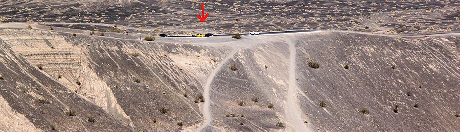 Nachdem wir alle Moviesets gefunden und das Manöver umfangreich fotografiert haben geht es wieder zurück nach Stovepipe Wells. Unterwegs kommen uns zwei „Erlkönige“ entgegen, also vermummte, noch nicht der Öffentlichkeit vorgestellte Testwagen. Es ist nicht ungewöhnlich, dass man hier im Death Valley auf die Erlkönige fast aller Automarken stößt, die zu Testzwecken den Pass hoch- und runtergejagt werden, jedoch ist die Jahreszeit außergewöhnlich. Üblicherweise tummeln sich die Hersteller im Hochsommer, wenn die Temperaturen annähernd täglich um die 50Grad liegen.