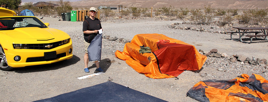 In Pahrump halten wir kurz beim „KFC“ für einen Snack und beim Walmart, um die ersten Mitbringsel einzukaufen. Gegen Mittag nähern wir uns dem Death Valley, was man nicht nur an der Landschaft sondern auch am Thermometer merkt. Bei über 30 Grad erreichen wir gegen 13:30Uhr „unser“ Stovepipe Wells. Zu unserer Überraschung ist das provisorische Visitor Center schon wieder abgebaut. Offensichtlich scheint das neue VC fertig zu ein, doch wohl noch nicht ganz. Der Parkplatz bietet nun einige überdachte, schattenspendende Plötze und die Restrooms sind erweitert, doch innen it s noch ein bisschen provisorisch. Die Ausstellung ist noch nicht installiert und noch viel schlimmen: Unser Außenthermometer, dass wir traditionsgemäß jedesmal fotografieren, ist weg ! Wir hoffen jedoch, dass es bald „remodelt“ wieder aufgehängt wird. Wir erkundigen uns bei der Rangerin, welche Campgrounds geöffnet sind und wie die nächtlichen Temperaturen auf „Wild Rose“ voraussichtlich sein werden, einer unserer favorisierten Campgrounds, der allerdings deutlich höher liegt. Im Hochsommer einer der einzig nutzbaren Campgrounds des Death Valleys, weil er durch seine Höhenlage etwas kühler ist, kann er in den anderen Jahreszeiten doch sehr frisch sein. Die Rangerin berichtet von etwa 10Grad in der Nacht, wohlgemerkt, das ist der von uns umgerechnete Celsius-Wert. Das ist ein akzeptabler Wert und so wollen wir uns auf den Weg machen, nicht jedoch, ohne kurz im Village nachzufragen, ob ein Zimmer frei ist. Es ist sehr unwahrscheinlich, um diese Tages- und Jahreszeit noch ein freies Zimmer zu erhaschen aber fragen kann man ja. Und siehe da: Es ist sogar noch ein Zimmer frei, sogar im Block der „Roadrunner“. Für die beiden darauffolgenden Tage haben wir bereits im Vorfeld ein Zimmer reserviert, ebenfalls im Roadrunner. Da wir aber für diese Tage einen „Dune View“ gebucht hatten, der heute nicht zu Verfügung steht, werden wir morgen das Zimmer wechseln müssen. Aber damit kann man leben! Als erstes fahren wir dennoch auf einen Campground, und zwar zum Emigrant um hier unser Zelt trocknen zu lassen, falls es noch feucht ist. Wir packen es aus und staunen nicht schlecht, wie viel Wasser noch in der Bodenplane ist. Ausgebreitet auf den Boden trocknen die Planen im Schein der brennenden Sonne innerhalb von wenigen Minuten. Das ist keine Übertreibung.
