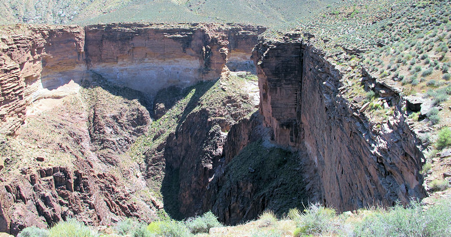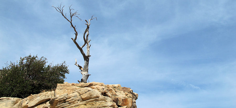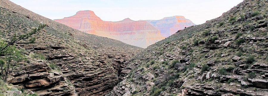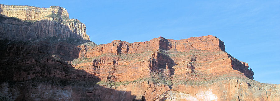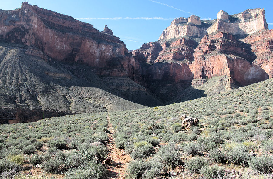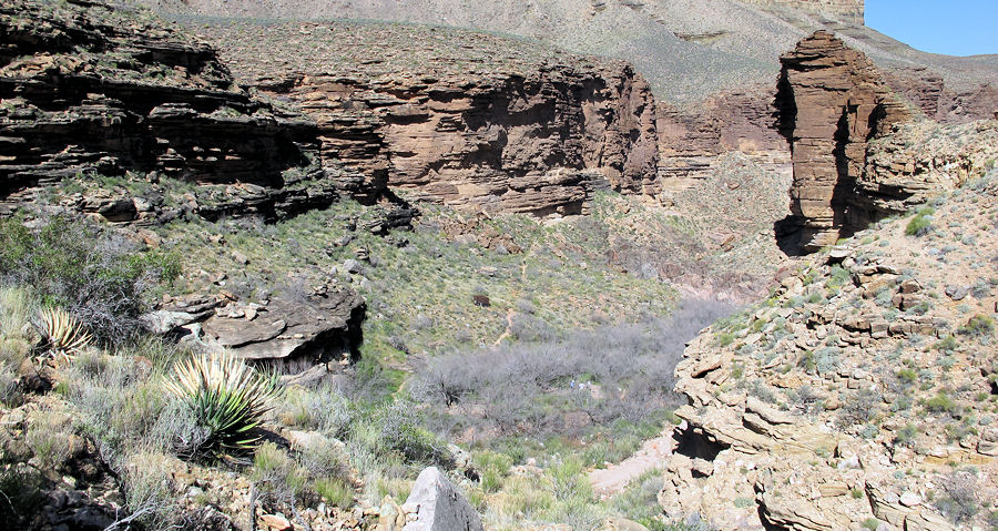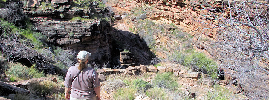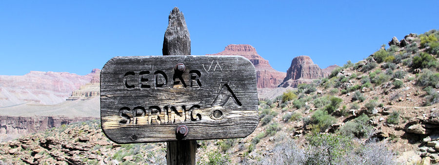 Um 9:45Uhr geht es wieder los und die Vorwarnung der Amerikaner, was uns jetzt erwartet, war nicht übertrieben. Es geht über eine längere Strecke in Serpentinen steil bergauf. Alles. was wir vorhin steil bergab in den Creek steigen mussten, wird uns jetzt wieder an Höhenmetern abverlangt und die eben mit der Pause erst gewonnene Energie schmilzt schneller als ein Stückchen Butter in der brütenden Hitze der Sonne über dem Grand Canyon. Nach diesem extremen Aufstieg meint es der Tonto Trail aber gut mit uns und von wenigen. eher zurückhaltenden Auf- und Abstiegen läuft es sich angenehm, so dass wir nach gut einer Stunde um 11:40Uhr Cedar Spring erreichen.....,