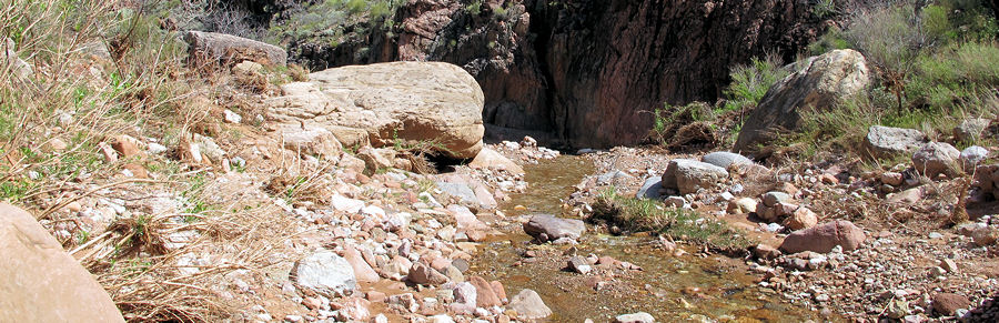 Es ist aber sehr anstrengend immer wieder die Seiten zu wechseln und einzelne Trampelpfade am Ufer zu finden. so dass wir uns entscheiden. überwiegend im Creek zu laufen. Das hat Vorteile: Bis auf wenige Wasserstufen ist das Bachbett sehr eben und gut zu belaufen. Außerdem kühlen die nassen Füße unsere aufgeheizten Körper, denn auf den dicht bewachsenen Trampelpfaden weht keinerlei Wind und die Sonne am wolkenlosen Himmel heizt die Böschungen auf. Uns ist absolut schleierhaft, weshalb dieser Trail auf unserer Karte mit "E" für "easy" klassifiziert wurde. Wir sehen ihn eher als "D" für "difficult".