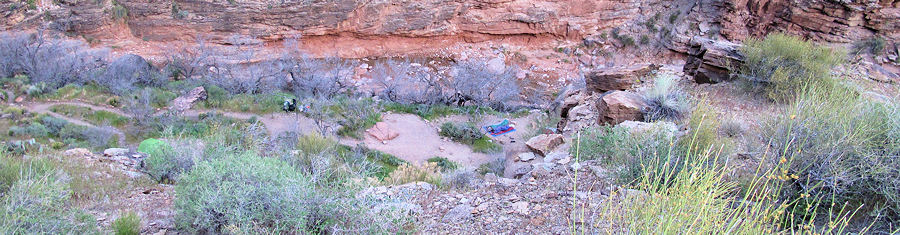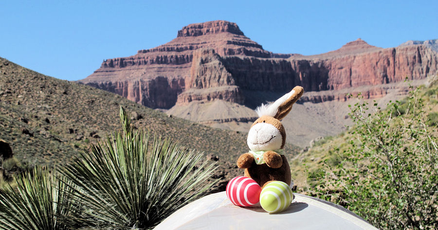 Nach einer weiteren, etwa fünf Minuten dauernden Pause, die wir im Schatten eines schlecht zu erreichenden Felsen kauern, geht es auf die Zielgerade. Der Meilenzähler unseres GPS-Gerätes zählt langsam runter und um 13:05Uhr erreichen wir geschafft aber glücklich Salt Creek. Hier ist der Bär los: Außer uns beiden sind null andere Hiker hier und wir haben die freie Auswahl zwischen zwei Campsites. Der Rest ist schnell erzählt. Unter dem einzigen etwas Schatten spendenden Fels abgekühlt, Zelt aufgebaut, im Schatten abgekühlt. den Innenausbau des Zeltes vorgenommen. im Schatten abgekühlt, auf die untergehende Sonne gewartet und dann gekocht. Und Ostern feiern wir aber auch noch – in aller Bescheidenheit.