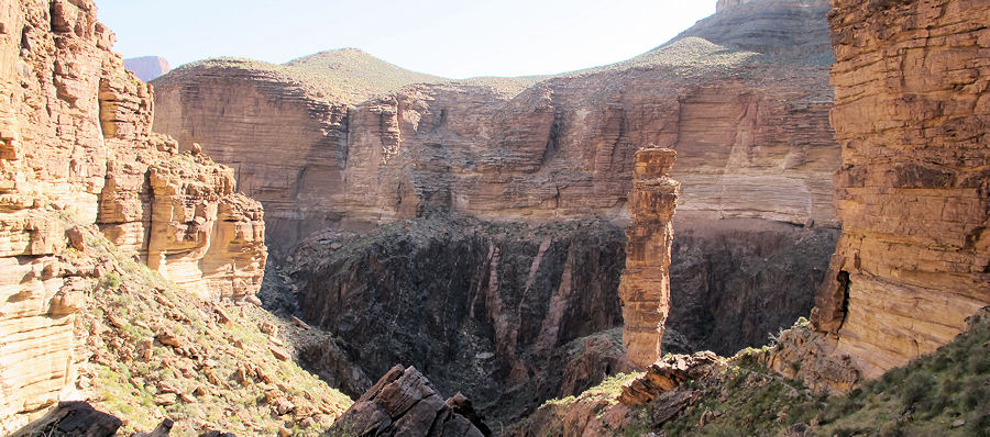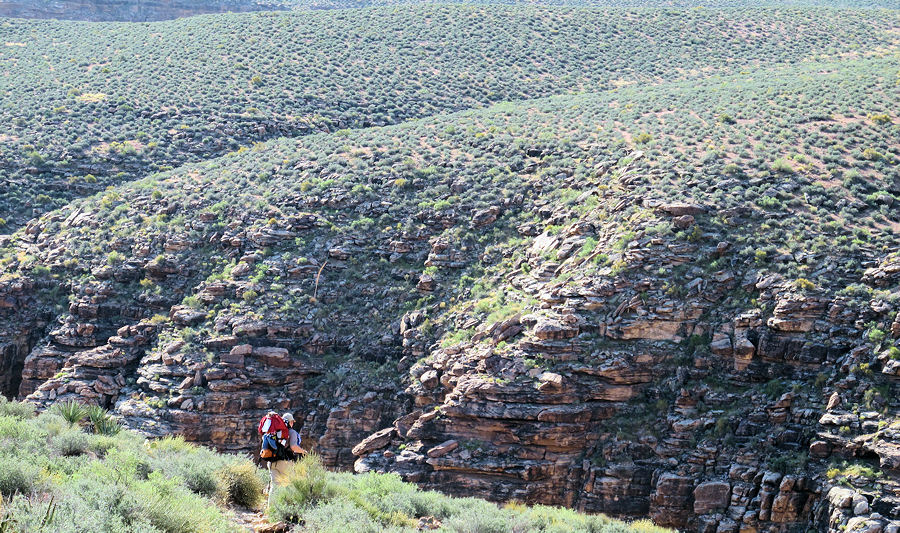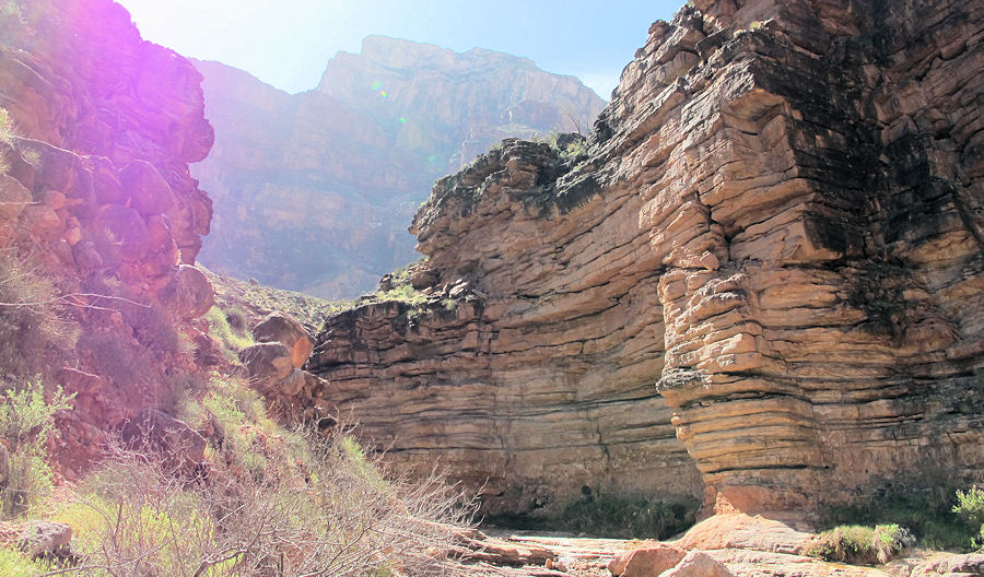 Wir machen uns auf den Weg zu den Hermit Rapids, das sind Stromschnellen im Colorado. Der Weg führt zurück über den gestrigen Weg bis zum Schild und von da aus hinunter in den Creek.