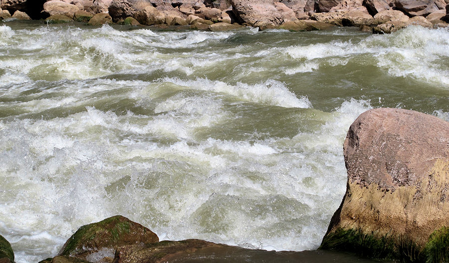 Der Hermit Creek plätschert als kleines Rinnsal in den Colorado und der ruhig dahinfließende Colorado verwandelt sich innerhalb von Bruchteilen von Sekunden in einen wilden, gefährlichen und unberechenbaren Strom. Die Stromschnellen, die nur wenige Meter vor uns liegen, peitschen das Wasser mit einem ohrenbetäubenden Lärm zu einem unbezähmbaren Fluss auf.