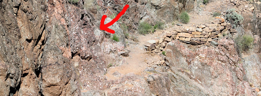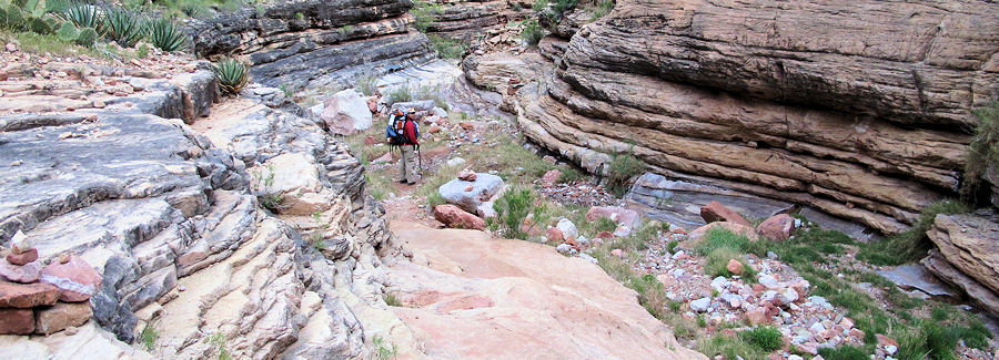 und nur eine Viertel Stunde später sehen wir uns mit einem großen Problem der Desorientierung konfrontiert. In einer Senke ist der weitere Verlauf trotz einiger Cairmen nicht eindeutig zu identifizieren, zumal wir nun unmittelbar an eine Weggabelung gelangen müssen, wo es entweder zu weiteren Rapids oder weiter auf unserem Tonto Trail geht. Wir rätseln eine ganze Zeit und entscheiden uns auf Basis von Karte, GPS und Hoffnung für eine Richtung, die sich um 8:50Uhr,als wir die richtige Junction Tonto Trail/Granite Rapids als richtig herausstellt.