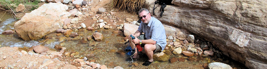 Kurz danach erreichen wir Monument Creek, der seinen Namen durch die monumentalen Felssäule hat, und wo wir uns nach dem weiteren Weg erkundigen, am Creek unsere Wasservorräte auffüllen und eine längere Pause machen. Ein Amerikaner gesellt sich zu uns an den Creek und filtriert das Wasser auf chemische Art. Eine interessante und einfachere Methode der Trinkbarmachung, mit der ich mich nach unser Rückkehr einmal beschäftigen werde. Auf meine Bitte hin erklärt er mir das Gerät sehr ausführlich und nicht ohne Stolz, wie man ihm anmerkt.