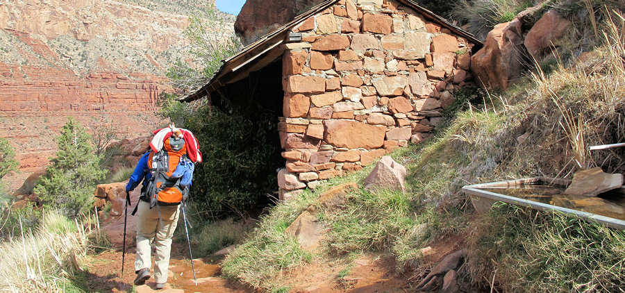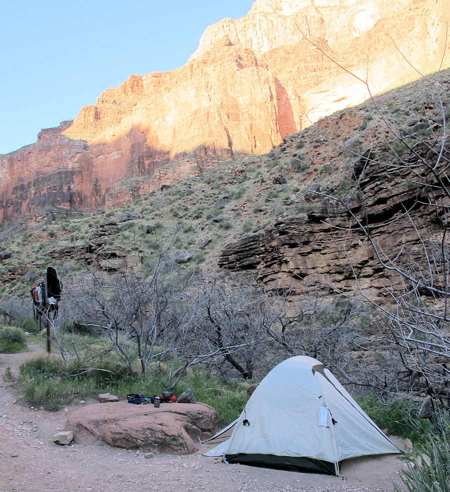 Nach 0,8Meilen gelangen wir zu einer weiteren Abzweigung. Rechts geht es zu den Hermit Rapids, die wir morgen erkunden werden, links zur ersehnten Campsite. Aber dorthin geht es nach etwa 200 Metern sehr steil bergab und der Weg ist felsig mit hohen Steinstufen. Also noch einmal richtig kräftezehrend. Unten angekommen passieren wir eine Group Campsite, wo wir gleich freundlich mit lautem "Welcome" begrüßt werden. Etwa 50 Meter weiter gibt es die Single Campsites. Vier Stück gibt es davon, zwei sind bereits belegt. Die Rangerin kommt zufällig des Weges und klärt uns gleich auf, aus welchen Campsites wir uns eine auswählen können und zwei Damen auf einer besetzten Campsite weisen uns darauf hin, dass das Wasser des Hermit Creeks fantastisch schmeckt. Wir belegen eine Site und bauen das Zelt auf. Der Aufbau des neuen Zelts geht im Nu, auch wenn wir unserem alten Vaude-Zelt immer noch nachtrauern. Dem klassischen Rollenverständnis von Mann und Frau gehen Anita und ich den genetisch verwurzelten originären Aufgaben mach: Die Frau kümmert sich um das Essen, der Mann geht auf die Jagd. . . nämlich nach Wasser. Ich erkundige mich bei den beiden Damen der Nachbarsite nach einem guten Zugang zum Creek und pumpe bzw. filtriere ein paar Liter Wasser. Jeder verwöhnte Mensch sollte in seinem Leben einmal zwangsverpflichtet werden, eine solche Tour mit eingeschränkten Wasservorräten zu unternehmen und das Wasser suchen und aufbereiten müssen. Ich bin mir sicher, dass man dann Trinkwasser wesentlich mehr zu schätzen weiß. Bei uns haben diese Erfahrungen vor einigen Jahren n völlig neue Wertschätzungen und Denkprozesse ausgelöst. Der Abend vergeht mit Essen aus der Tüte, für Anita gibt es Makkaroni Cheese und für mich Spaghetti Bolognese. Wie schon auf früheren Touren bereits erwähnt schmeckt dieses Tütenfutter entweder wirklich gar nicht mal so schlecht oder der Hunger treibt es rein. Nach etwas Smalltalk mit den Nachbarn und einer traumhaft gut schmeckenden Tasse Kaffee geht es um 20Uhr ins Bett. Übrigens ist es ziemlich egal, ob der Kaffee zu stark oder zu dünn ist, hier im Backcountry am Ende eines anstrengenden Hikes schmeckt der Kaffee stets als wäre es Champagner.