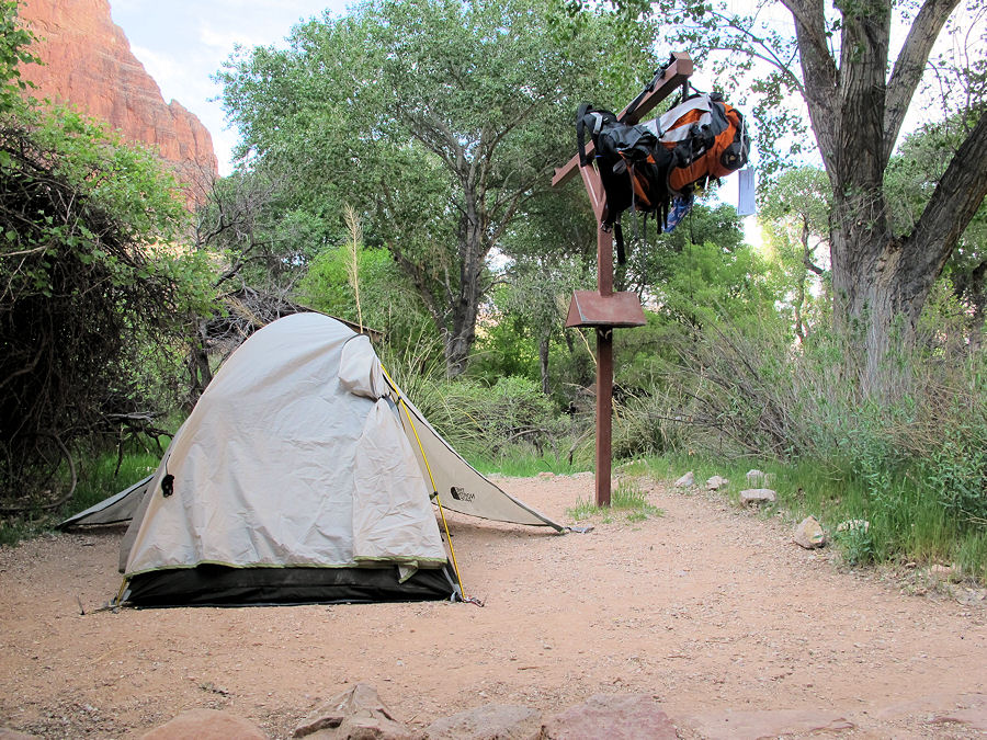 und hier begegnen uns viele Kurzhiker. Ich bitte die nachfolgendem Äußerungen nicht als arrogant unverschämt zu verstehen, ich stelle aber wieder fest, dass es Unterschied zwischen Touri-Hiker (die wir sonst ja auch sind) und richtigen Hikern gibt. Wir erleben plötzlich, dass man sich nicht mehr grüßt oder sich gegenseitig den Weg frei macht, was bei Trekking-Touren absolut selbstverständlich ist. So fragt man sich stets gegenseitig, wo man herkommt, hin möchte, ob alles o.k. ist usw. Gut, würde man das in diesem Umfang auf dem Trail zum Plateau-Point machen, käme man keinen Meter von der Stelle. Aber dies nur so nebenbei. Nach 5 Stunden und 10 Minuten erreichen wir Indian Garden und haben somit 7,3 Meilen hinter uns gebracht. Für unsere Verhältnisse ist das eine super Zeit, auf die wir stolz sein können. Jetzt heißt es nur noch eine Campsite zu entern, das Zelt aufzubauen und Anita beginnt unser heutiges Fine Dining, wie das die Amerikaner nennen, vorzubereiten. Das heißt, wir haben einen Tisch. eine ordentliche Sitzgelegenheit, Trinkwasser. das vorher nicht gefiltert werden muss, und ein Essen, für das man statt eines Löffels Messer und Gabel benötigt. Denn heute gibt es Chickenbreast with Rib Meat und Mashed Potatoes. Natürlich trotzdem aus der Tüte.