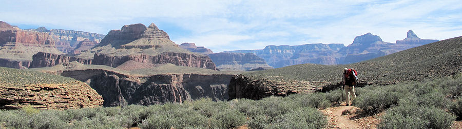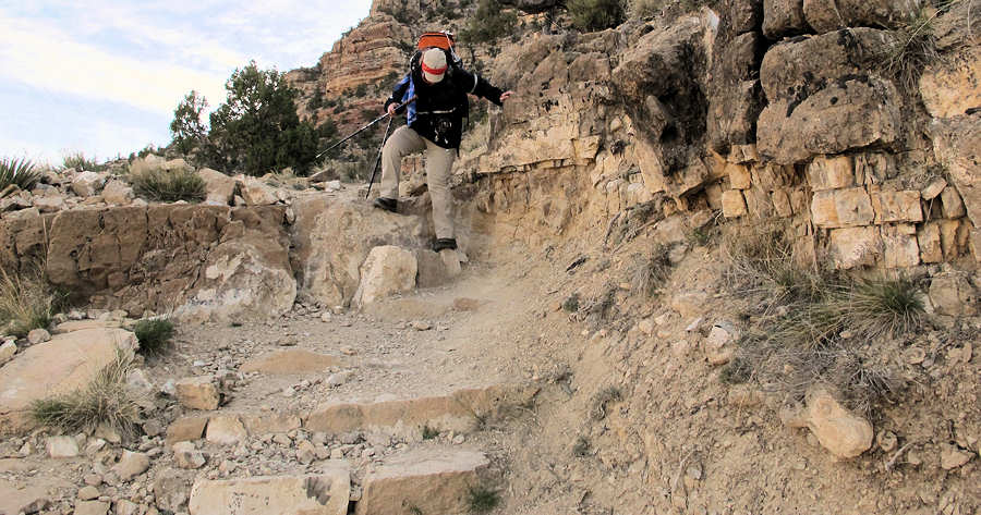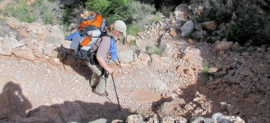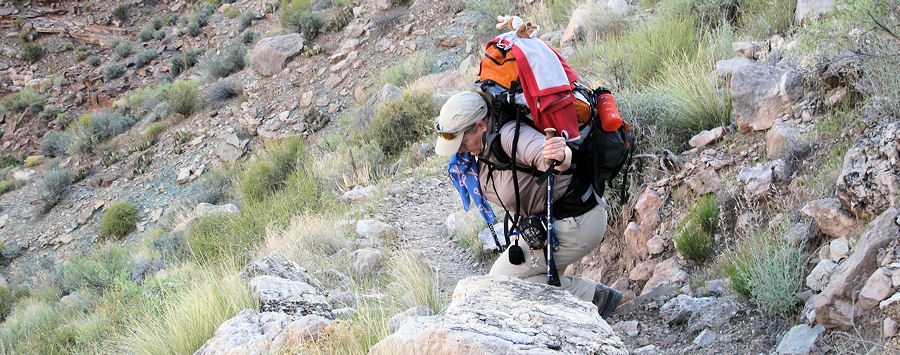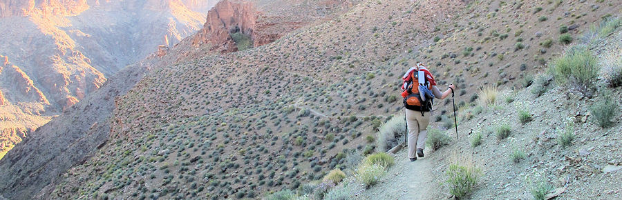 Steil geht es bergab. Wir kennen den Hermit Trail nur im Ansatz, weil wir ihn zum Probelaufen oder -wie wir es nennen- "Anhiken" im letzten Jahr auf eine Länge von 1,6 Meilen erkundet haben. Er wurde mal von der Santa Rail Road gebaut und war lange Zeit der bestausgebaute Trail in den Innercanyon. Das ist lange vorbei. Heute ist es zwar nach wie vor traumhaft schön, allerdings kaum bewirtschaftet und nur gering frequentiert. Man muss nicht mit den Massen der Touris und Kurzhiker rechnen. Da es hier auch nur an einigen Stellen Wasser gibt, ist heute der Bright Angel Trail der Massentrail des Innercanyons.