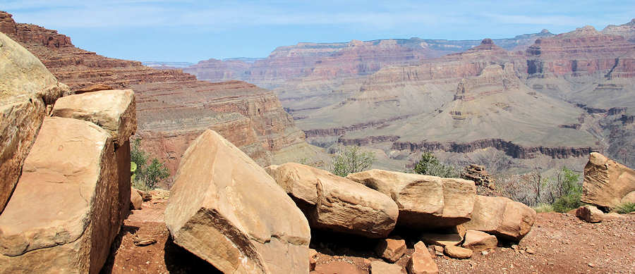 Kurz vor der Junction Hermit Trail / Tonto Trail rasten wir im einzigen Schatten weit und breit. Ein großer Fels spendet genug Schatten um kurz zu verschnaufen.