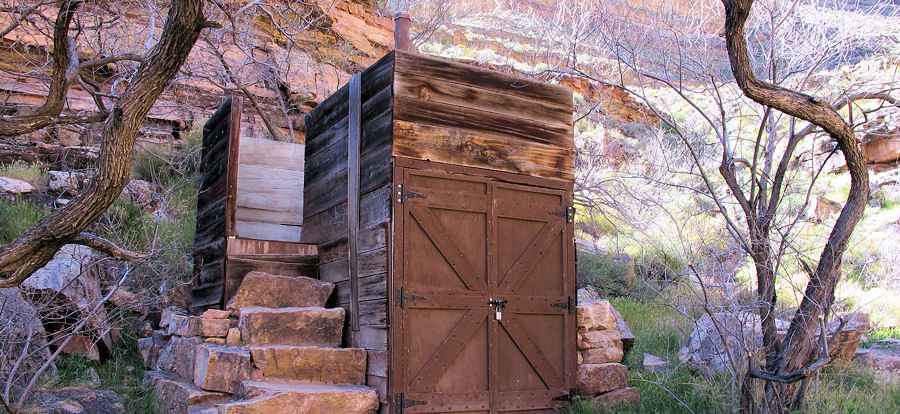 Nach einer gemütlichen Tasse Kaffee und genau drei Keksen pro Person machen wir uns ausgehfertig. Dazu gehört auch der Gang auf die Restrooms. Nun ziert es sich ja eigentlich nicht, dass man über die Toiletten redet oder gar schreibt, doch diese hier dürfen nicht unerwähnt bleiben. Es handelt sich um ein Plumpsklo, und zwar um ein Cabrio. Man geht ein paar Stufen hinauf, ist umgeben von einem Sichtschutz und sieht nach oben in den Himmel. Schlimmstenfalls auch auf Hiker. die gerade von oben auf den Campground absteigen. Aber das sieht man hier trotz der prüden USA im Backcountry nicht so eng.
