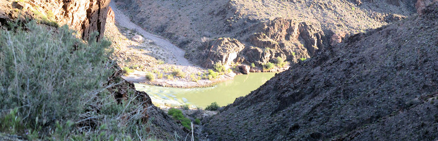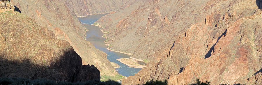 Zunächst geht es über bekanntes Terrain bis zur Abzweigung zu den Rapids und dann bis zur Kreuzung Tonto Trail / Hermit Trail, die wir um 7:00Uhr erreichen und wir somit nun schon 1,2 von den insgesamt 6,9Meilen hinter uns haben. Bisher ging es sehr beschwerlich nur bergauf. Nach nur wenigen Minuten eröffnet sich uns ein erster Blick auf den Colorado runter, der mit seinen von hier oben eher unspektakulär wirkenden Rapids einen friedlichen Eindruck erweckt.