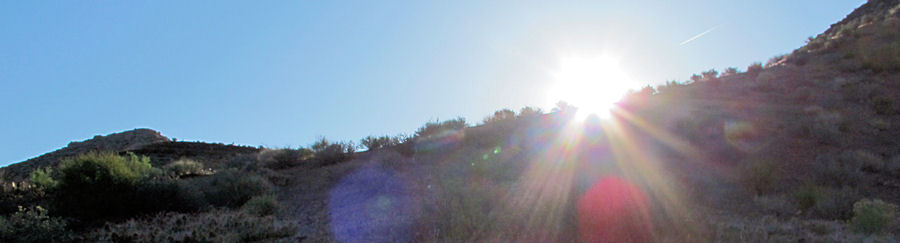 wo wir eine kurze Pause im Schatten verbringen. Das ist übrigens das große Problem: Auf der ganzen Strecke ab Monument gibt es so gut wie keinen Schatten. Wenn man Glück hat findet man einen Fels, unter den man sich teilweise verkriechen kann. Hier in Cedar Spring verspricht der Name mehr als er hält. Die Quelle ist sehr unzuverlässig, spendet nur temporär Wasser und wenn. dann soll es wohl sehr schwer sein es zu gewinnen. 4,8Meilen liegen nun hinter und noch 2,1 Meilen vor uns. Nach einer kurzen Verschnaufpause geht es wieder raus in die gnadenlose Sonne. Es ist jetzt etwa 12:Uhr und unser Thermometer beginnt, die 30Grad-Marke zu knacken.