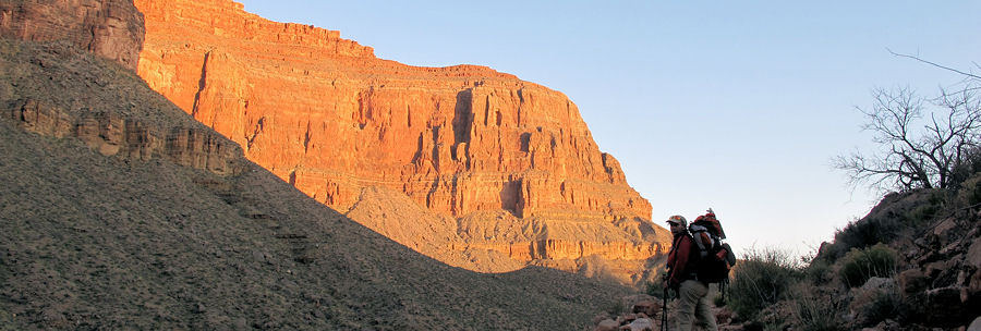 Mittwoch, 11.April 2012 Um 4:00Uhr beginnen wir mit dem Abbau um möglichst wieder die kühle Zeit des Tages zum Hiken zu nutzen. Diesmal sind wir sogar nach einer guten Dreiviertelstunde fertig. Wir bemühen uns, absolut leise zu sein um die anderen Hiker nicht zu wecken. Aber das ist nicht nötig. Auf mehreren Sites herrscht emsiges Treiben, denn auch andere wollen früh aufbrechen. Um 5:00Uhr brechen wir komplett aufgerüstet auf. Dass jeder von uns aufgrund der geringeren Wasservorräte und des teilweise aufgebrauchten Proviant mittlerweile etwa drei Kilo weniger Gewicht auf dem Rücken trägt merkt man m.E. nur beim Aufsetzen der Rucksäcke. Beim Tragen merken wir kaum Unterschiede. Zu Beginn gehen wir noch mit den Kopfleuchten, doch schon nach einer halben Stunde ist das Firmament leicht erhellt, so dass es kein Problem ist, den Trail auch ohne Lampen zu erkennen.