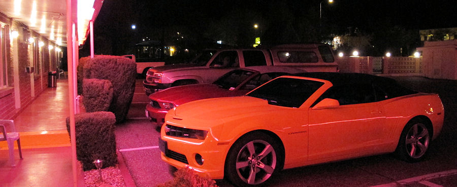 Beim Anblick des Camaros verdrängen wir beide sofort, dass 6,3Liter Hubraum und weit über 400PS an der Tankstelle sicherlich einen kräftigen Durst haben. Beim Öffnen des Wagens werden wir weiter überrascht: Der Kofferraum ist nicht kleiner als beim Mustang und unser Postauto ist bestens ausgestattet: Navigationssystem, Notrufsystem, Sitzheizungen usw. Beim Rückwärtsfahren dann der nächste Knüller : Im Innenspiegel sehe ich plötzlich die Straße hinter mir eingeblendet. Der Wagen hat also sogar eine rückwärtige Kamera. die sich winzig klein im Heck versteckt und auch bei unterschiedlichster Helligkeit ein kristallklares Bild ergibt. Dass Tacho, Drehzahlmesser und der Radiosender beim Fahren in der Windschutzscheibe eingeblendet werden überrascht dann bei der Ausstattung kaum noch. Doch wir schreiben hier einen Reisebericht und keinen Fahrbericht, so dass wir uns jetzt auf die wichtigen Punkte unseres Urlaubs konzentrieren wollen. Die erste Anlaufstelle ist der Storage, wo wir unser Equipment sortieren und einladen. Nach einer knappen Stunde verlassen wir das Gelände in Richtung Best Western McCarran Inn. Das von uns diesmal reservierte Luxury-Zimmer, eine völlig neue Kategorie und auf das wir schon sehr gespannt sind, entpuppt sich als ein Zimmer, das wir auch schon früher hatten. Alter Wein in neuen Schläuchen nennt man das. Also ein Zimmer. das es schon immer gegeben hat, aber eine neue Kategorie. Neu ist, dass man jetzt einen Zugangscode für das W-LAN benötigt. Also keine Chance mehr für uns, wenn wir in Vegas am Ende des Urlaubs mal schnell unterwegs ins Internet müssen und wir bisher dann mal schnell vor dem Hotel angehalten haben. Jetzt geht es weite zum Walmart um die üblichen Dinge einzukaufen: Batterien, Getränke, Kosmetik und Freeze Dried-Nahrung. Letztgenannte würden wir auch am Grand Canyon kaufen können, doch die führen seit letztem Jahr eine neue Marke, die uns überhaupt nicht geschmeckt hat. Nach einem kleinen Snack am dortigen Walmart angegliederten Cuisine (McDonalds) geht es zurück zum Hotel zum Umpacken. Mittlerweile ist es 8Uhr und wir kämpfen vergebens gegen die Müdigkeit. Nächstes Grundgesetz: Egal, ob du im Flugzeug nicht geschlafen hast (Anita) oder viel (ich), die Müdigkeit packt dich auf jeden Fall und der Jetlag auch. Und so sind wir um 4Uhr wieder hellwach.