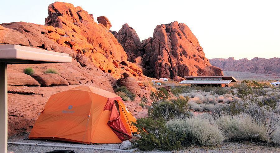 Beim Abbau des Zeltes merken wir leider, dass die Luftfeuchtigkeit kondensiert hat und das Zelt ziemlich nass ist. Also lassen wir die Planen in der langsam aufgehenden Sonne trocknen. Der Himmel ist blitzsauber, d.h. ein kräftiges Blau zieht auf und lässt die roten Felsen des Valley Of Fire erflammen, so wie man das von hier gewohnt ist.