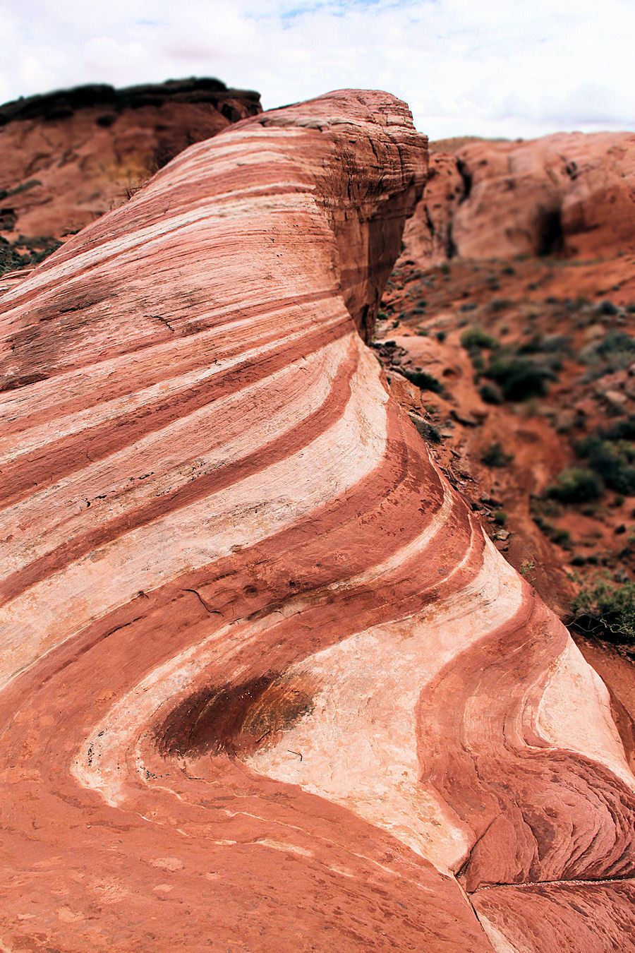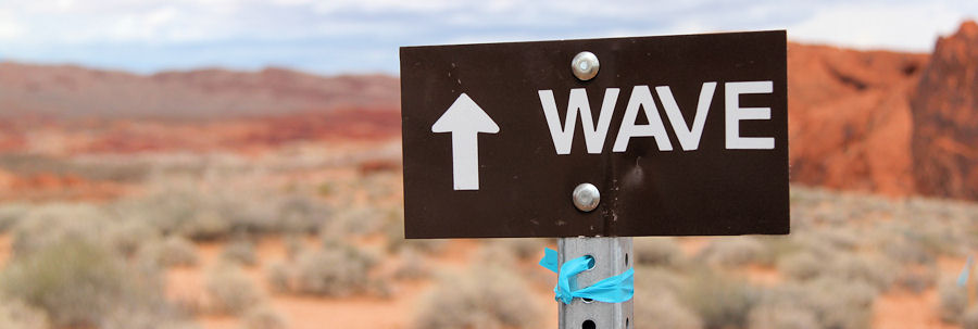 Genau gegenüber weist ein Schild „Wave“ auf den Trail hin. Der komplette Weg ist mit blauen Bändern markiert, so dass ein Verlaufen schwer fallen wird. Nach etwa 1 km Luftlinie zum Parkplatz erreichen wir die Felsformation. Evtl. ist es der stark bewölkte Himmel und das damit verursachte Licht, dass den Felsen eher unspektakulär erscheinen lässt oder es sind unsere hoch geschraubten Erwartungen, weshalb wir etwas enttäuscht sind.