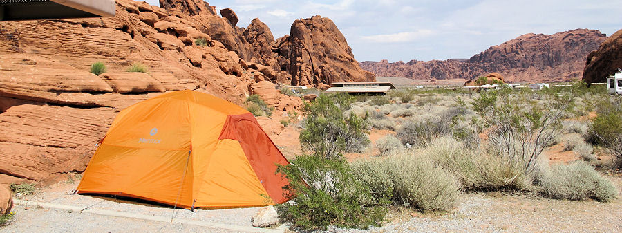Die Nacht war - meiner gestrigen Vorhersage entsprechend - angenehm. Um 7:00Uhr sind wir schon auf der Piste in Richtung Zion. Im Golden Hill Restaurant frühstücken wir und - wer uns kennt - weiß natürlich, dass wir das hauptsächlich wegen der unvergleichlichen Scones tun. Danach geht es zum Zion, den wir etwa gegen 8:30Uhr erreichen. Wir haben hier zwei Reservierungen für die nächsten Tage, und zwar einmal in der Zion Lodge und das andere Mal auf dem Watchman Campground. Von der letztgenannten Reservierung würden wir aber sofort zurück treten, wenn die Raupenplage, die es in den letzten beiden Jahren jeweils um diese Jahreszeit gab, wieder herrscht. Doch zu unserer Freude geht man wohl massiv gegen dieses Problem vor und hat sehr vielen Bäumen einen Gürtel aus einem sehr klebrigen Material verpasst, ähnlich den bekannten Fliegenfängern. Wie das ganze funktionieren soll, wissen wir zwar nicht aber es funktioniert: Nur wenige Raupen sind (im Moment) zu erkennen. Mit dem ruhigen Gefühl geht es weiter nach Hurricane, wo wir zunächst beim Walmart einen kurzen Einkauf tätigen und dann mal wieder tanken. Sylvia, eine unserer HP-Leserin, hat uns angefragt, ob unser Postauto denn tatsächlich so viel Sprit wie befürchtet verbraucht. Dem wollen wir jetzt auf den Grund gehen. Beim nächsten Tanken in ein paar Tagen werden wir den Spritverbrauch dann ausgerechnet haben. Die nächste Station ist das Valley Of Fire. Obwohl es jetzt schon nach elf Uhr ist und auch noch Freitag ist, gibt es noch genügend freie Campsites. Auf einer Site, die uns gefällt, bauen wir erstmalig das Zelt auf, das wir letztes Jahr am Ende des Urlaubs erstanden haben.