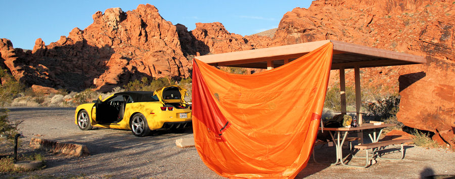 Zwar ist es windig und wir kämpfen damit, unser neues Zelt nicht schneller zu verlieren als wir es erstanden haben, aber der Aufbau geht erstaunlich schnell und unkompliziert. Der Vorteil ist, wie wir feststellen, dass man den Footprint als erstes mit Heringen fixieren kann und dann das Zelt darauf aufbaut. Das erleichtert die Sache bei starkem Wind. Sonst mussten wir die Plane immer erst auslegen und bis wir das Zelt fixieren konnten war der Footprint meist schon wieder weg. Das aber nur für die Zelt-Interessierten. Nach dem erfolgreichen Aufbau müssen wir kurz nach Las Vegas (das ist kein Witz). Wir tauschen unsere Backpacks gegen die Daypacks, holen die große Spiegelreflex aus dem Storage und beim Best Western meine Akkus, die wir letzte Woche dort verloren hatten.