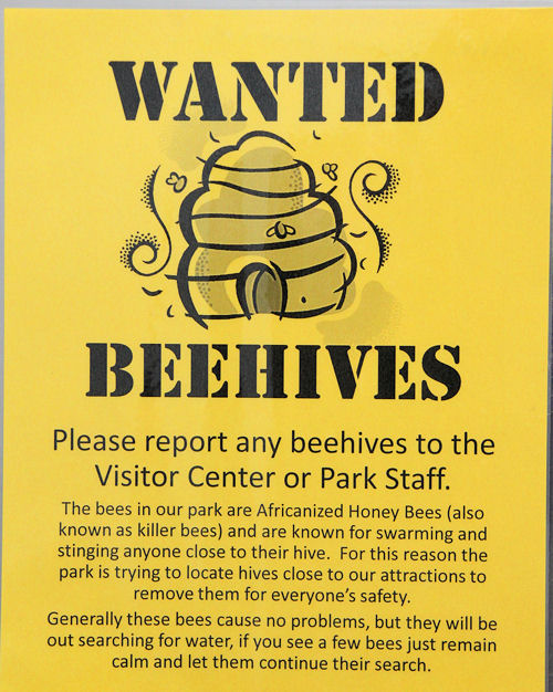 Das ist jetzt kein Witz. An mehreren Stellen im Park wird ausdrücklich und ausführlich vor den sog. Killerbienen, die eigentlich „Africanized Bees“ heißen gewarnt. Eine aggressive, in den 50er Jahren von Menschenhand gekreuzte Bienenart, die den Forschern aus der Kontrolle geraten ist, und sich als äußerst aggressiv zeigt. Sie wandert seit Jahrzehnten kontinuierlich aus Südamerika gen Norden und hat jetzt schon einige südliche Staaten der USA erreicht. Sie greifen zwar erst dann an, wenn sie sich provoziert fühlt, das Problem ist aber ein anderes. Während europäische Bienenvölker in einem solchen Fall einige Bienen zur Abwehr ausschwärmen lassen, schwärmt hier das komplette Volk zum Angriff aus und sticht nur um sich. Im Visitor Center habe ich die nette Formulierung gefunden: Jede Biene kann zwar nur 1 x stechen, sie hat aber Millionen von Freunde! Etwa 50 Bienenstiche können bei einem Kind schon zum Tode führen, bei einem Erwachsenen ist ab 100 mit ernsthaften Folgen zu rechnen.