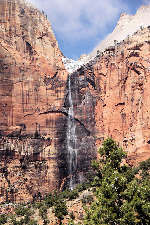 Hier schnappen wir uns einen Shuttle und fahren den Drive auf und ab und steigen am Temple Of Sinawava auf. Beeindruckend sind mehrere Wasserfälle im Park. Von hoch oben stürzen an mehreren Stellen enorme Wassermengen in die Tiefe. Diese Falls kennen wir überhaupt nicht, obwohl wir den Park schon zu den unterschiedlichsten Jahreszeiten besucht haben. Wir fragen uns, ohne eine Antwort zu finden, ob diese Wasserfälle das Resultat der Schneeschmelzen in den letzten Wochen ist oder mit den starken Regenfällen der letzten Tage zusammenhängt.