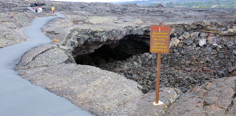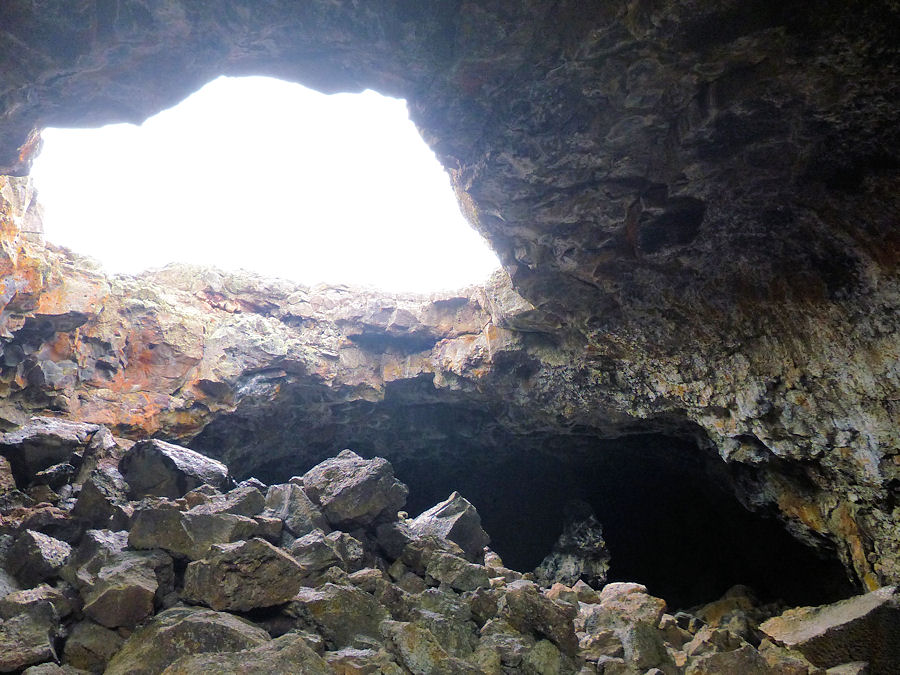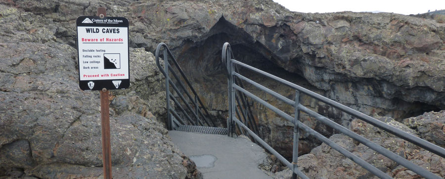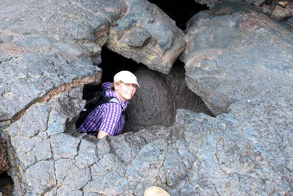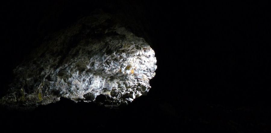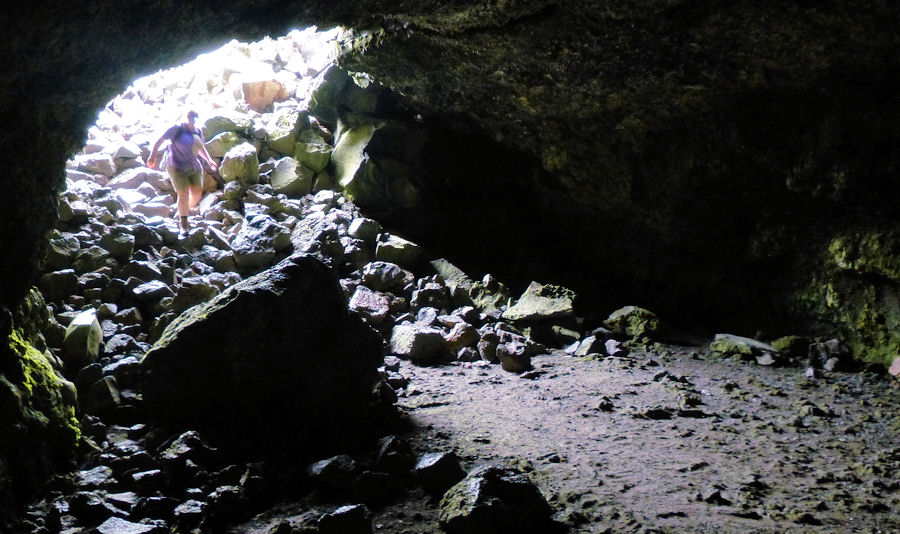 Ein einfach asphaltierter Weg führt uns vom Trailhead aus über das Lavafeld. Nach einer Viertel Meile erreichen wir eine Weggabelung, an der wir den Eingang zur ersten Höhle, der Dewdrop Cave, erkennen. Wir vernachlässigen sie im Moment, weil uns vorrangig den Indian Tunnel interessiert. Denn erreichen wir, in dem wir den rechten Weg einschlagen und nach etwa 200 Metern den Eingang erreichen. Wir steigen die Leiter hinab und geraten in ein großes zunächst dunkles Loch. Der Tunnel erscheint uns nicht nur riesig, er ist es auch: Knapp 10 Meter in der Höhe und gut 15m in der Breite misst er. Allmählich gewöhnen sich die Augen an die Dunkelheit und so vermögen wir sogar ohne Taschenlampen den Weg mehr oder weniger gut zu erkennen. Obwohl der Weg nicht all zu schwer zu gehen ist waren die Hinweise im Visitor Center, eine Taschenlampe dabei zu haben und geschlossene Schuhe zu tragen sinnvoll. Trotz Taschenlampen-Licht und vorsichtigem Gehen lässt es sich nicht immer vermeiden, mit dem Fuß an einen Fels zu stoßen. Der Tunnel hat eine Länge von etwa 250 Metern, wovon wir gut 200 Meter in westliche Richtung gehen können. Die Luft ist zwar recht frisch aber nicht kalt. Da heute Labor Day ist sind viele Familien mit Kindern unterwegs und die haben hier unten im Tunnel einen Riesenspaß, mit ihren Taschenlampen auf Abenteuersuche zu gehen. Und machen wir nichts vor: Anita und ich bestätigen uns gegenseitig, dass wir als Kinder ebenfalls einen Riesenspaß bei einer solchen Exkursion gehabt hätten. Und wir ergänzen das: Auch heute !!! Nach einiger Zeit fällt erneut Licht am Ende des Tunnels hinein. Eine große Öffnung liegt über uns aber hier kommen wir nicht raus, weil die Öffnung viel zu hoch und die Wände viel zu steil sind. Stattdessen biegen wir in einen kleinen Nebenarm ab, der so niedrig ist, dass man nicht nur en Kopf einziehen muss sondern sich sogar gebückt aus dem Tunnel rausklettern muss.
