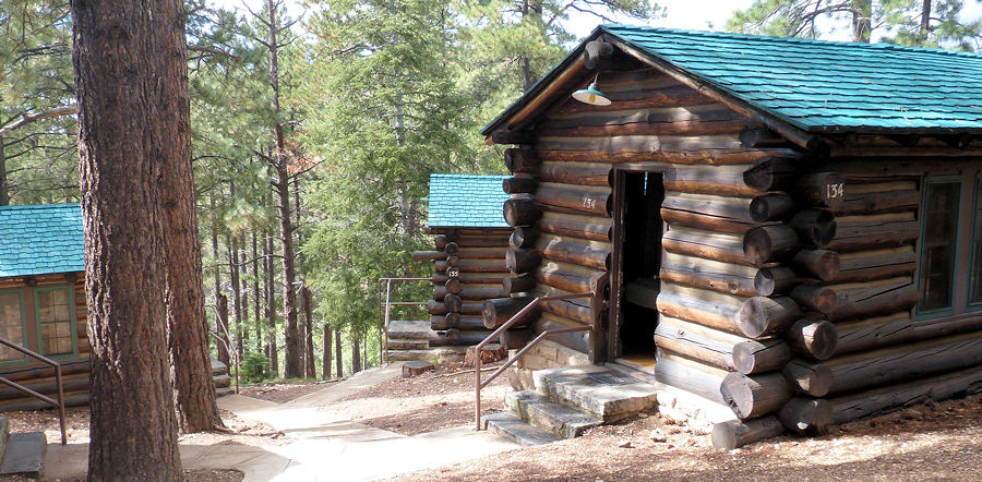 Einmal gibt es den Hauptraum und dann neben dem Bad ein zweiter Raum mit zwei Etagenbetten sowie einer Ausziehcouch. Man kann hier also mit bis zu 6 Personen hausen, muss sich dann aber die Toilette teilen. Die terrassenähnliche Anordnung der Hütten erlaubt es, vom Bett aus der Nachbarhütte ins Zimmer zu blicken. Und selbstverständlich heißt das im Umkehrschluss, dass die Nachbarkabine auf der anderen Seite uns ins Zimmer sehen kann. Wir sind zufrieden, die Ausstattung ist einfach aber der Stil ganz urig. Leider war es die einzige freie Cabin, eine sog. "Pioneer-Cabin", gerne hätten wir sonst eine "Western-Cabin", die auch noch eine Terrasse mit Schaukelstühlen besitzt. Gerne hätten wir beim Check-Inn gleich um einen Tag verlängert doch alle Cabins sind "sold out" für den nächsten Tag. Nach einem kurzen Bestaunender Hütte gehen wir kurz zum "Deli at the Pines", eine kleine Snackbar, um eine Kleinigkeit zu essen bevor wir dann zum Rim gehen um endlich, da es im Moment nicht mehr regnet, den Canyon sehen zu können. Doch der Regen hält nicht lange inne und daher geht es zurück zur Cabin zum Duschen, Bericht schreiben usw. Und jetzt endlich ziehen die Wolken fort, so dass wir vielleicht doch noch einen schönen Sonnenuntergang erleben dürfen. Uns zieht es also erneut zum Rim und wir wollen das ganze auch noch steigern und ergattern uns einen der begehrten Plätze auf der Veranda der North Rim Lodge.