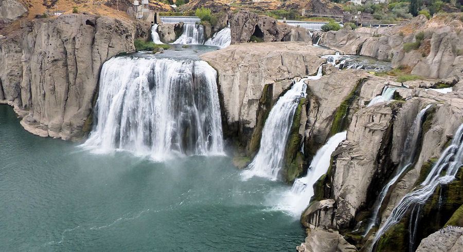 kein Aussichtspunkt bekannt, den wir als Besucher nutzen dürften. Der Wasserfall wird auch gelegentlich "The Niagara of the West" betitelt und wenn uns das im direkten Vergleich etwas übertrieben scheint ist es andererseits auch nicht ganz gelogen. Dieses Schauspiel muss im Frühjahr noch grandioser sein, wenn die Wassermassen aufgrund der Schneeschmelze anschwellen. Überhaupt sind wir vom momentanen Wasserstand überrascht, da wir im Internet gelesen haben, dass die Wassermassen im Hochsommer zu einem Rinnsal verkümmern können. Wir können uns an der Szene kaum satt sehen, wenden uns aber dann nach knapp einer Stunde doch anderen Dingen zu und fahren von hier aus "um die Ecke", im wahrsten Sinne, zum Power Plant Twin Falls, dessen Name uns hat neugierig werden lassen. Wir gelangen zum Wasserkraftwerk und der nebenliegende Viewpoint ist enttäuschend: In einiger Entfernung erkennen wir die Staustufe, von der aus das Wasser auf nachfolgende Terrassen überläuft. Die Anlage sowie der Verlauf des Wassers lässt uns erahnen, dass dieser Aussichtspunkt während der Schneeschmelze, wenn ein Vielfaches an Wasser hinabströmt, deutlich beindruckend zu sein scheint. Vielleicht kommen wir ja mal im Frühjahr wieder vorbei. Gegen 9Uhr etwa verlassen wir den Park und just erst in diesem Moment beginnt der Ranger, sein Kassenhäuschen zu besetzen. Unsere Bereitschaft, die Eintrittsgebühr nachträglich zu begleichen, fällt nicht auf fruchtbaren Boden. Unser
