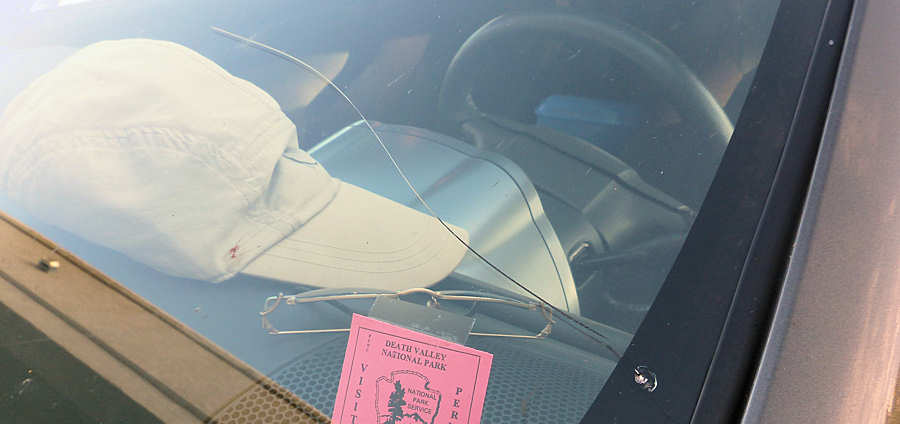 gehabt zu haben. Zwischen Zion und Mesquite passiert es dann: Wir müssen erkennen, dass das laute Knacken von vorhin doch nicht folgenlos geblieben ist. Ein Riss hangelt sich von der linken Seite langsam über die Windschutzscheibe. Wir beobachten den Schaden und stellen fest, dass er sich alle 20 Meilen um einen Fingerbreit vergrößert. Als wir in Mesquite ankommen hat er schon eine recht beachtliche Größe von ca. 30cm.