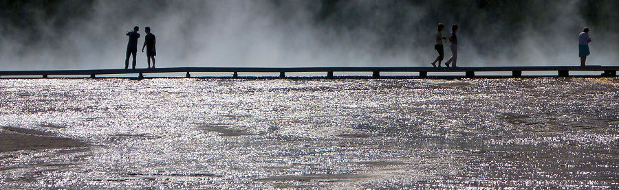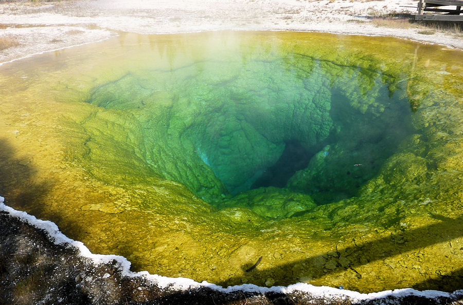 07:20: Abfahrt in Richtung "Old Faithful" (in etwa: Der alte Zuverlässige) 08:50: Erster Ausbruch des Geysirs "Old Faithful" unter begeistertem Staunen von den "Old Faithfuls" Anita und Hartmuth 09:00: voraussichtliche Eruptionszeiten verschiedener Geysire notiert und ausgiebiger Spaziergang durch das "Upper Geyser Baisin" : Um 9:51Uhr, wenige Minuten vor der vorhergesagten Zeit Eruption des Geysirs "Daisy" Als Höhepunkt dieser Sektion (vom Old Faithfuls und den Old Faithfuls ;-) einmal abgesehen: Der Morning Glory Pool, der in den himmlischsten Farben strahlt und weit über en Yellowstone bekannt ist: 13:00: Pause auf der Veranda der Old Faithful Cafeteria 13:19: