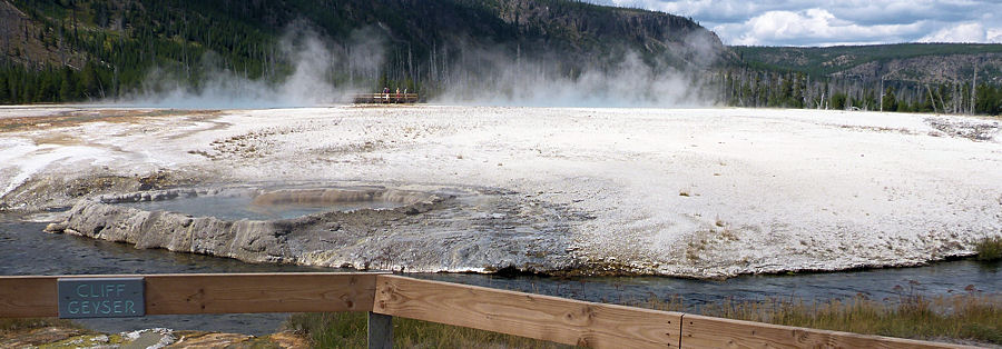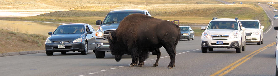 14:00: Abfahrt in Richtung Madison und Foto- und Spaziergangstopps im Biscuit Basin und Lower Geyser Basin mit Fahrt durch den Firehole Lake Drive. Kurz vor Madison Fahrt durch den Firehole Canyon Drive, der an einer Stelle sogar Zugang zum Firehole River gewährt, wo Schwimmen erlaubt ist. 16:00: Von Madison in Richtung Norris vorbei an Canyon Village zu unserer Cabin in Lake Village. Dabei eine Vielzahl von Bisons gesehen, sogar auf der Straße um uns herum.