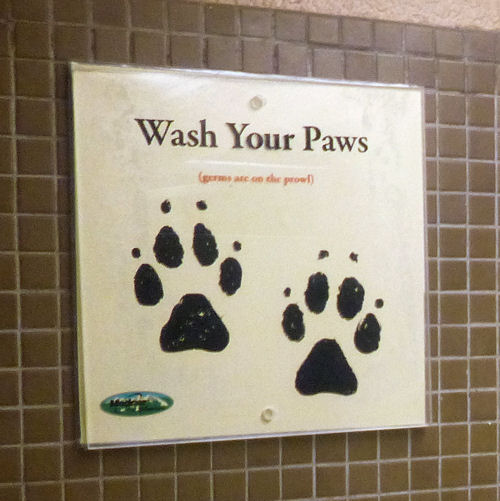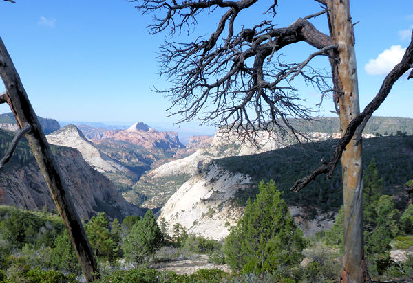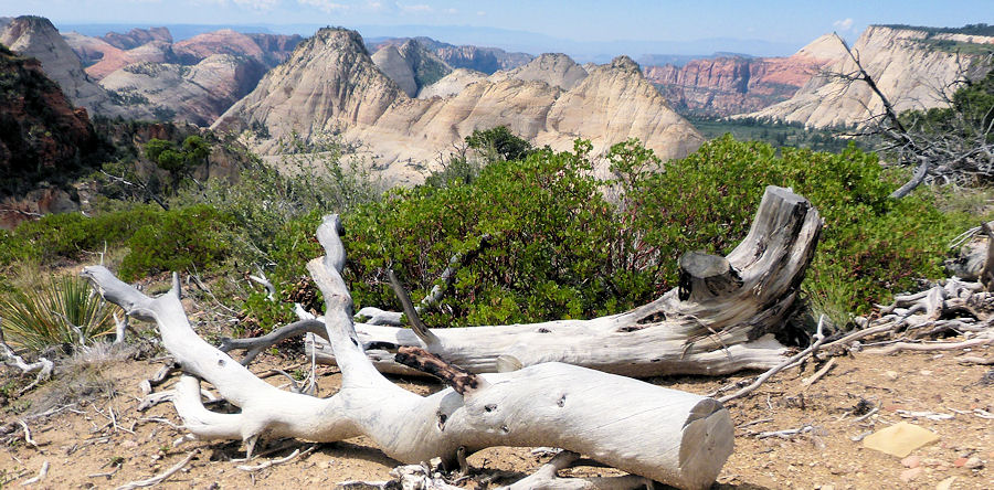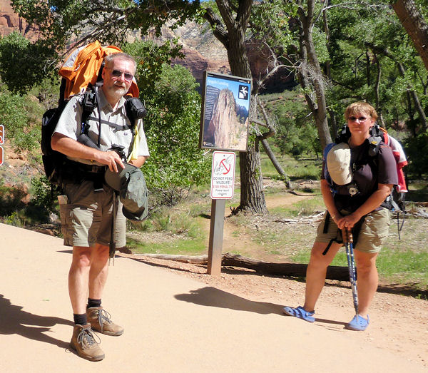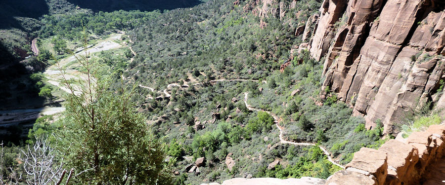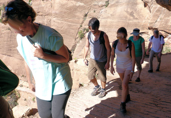 risst bzw. seine Beute zu einem sicheren Ort bringt. Ob das alles dem wirklichen Tathergang entspricht wissen wir beide nicht aber es klingt richtig logisch. Nach 2,9 Meilen stoßen wir auf Scotts Looksout, einem beliebten Aussichtspunkt für Hiker, die zu Angel`s Landing wollen. Dieser Ort bietet einen herrlichen Blick auf das, was diese Hiker noch erwartet. An Drahtseilen steil nach oben. Diese Stelle ist für viele Hiker ein guter Rastplatz für "zwischendurch" und für andere der Punkt zu rasten und dann schnell umzudrehen und wieder abzusteigen. Wir haben schon einige erlebt, die uns sagten, dass sie sich den Rest des Hikes "nicht antun" und auch von hier einen guten Blick haben. Hier beginnt auch das Leben. Seit gestern Morgen haben wir, von einem Hiker-Trio in Potato Hollow einmal abgesehen, keinen einzigen Menschen mehr gesehen und hier trifft man sie gleich in Massen. Klar, denn Angel`s Landung ist eine anstrengende aber auch beliebte Tour. Wie bereits einmal erwähnt war es genau diese Tour, auf die wir in einem Bericht im Kölner Stadtanzeiger aufmerksam gemacht wurden und die der Auslöser unserer Begeisterung für das Wandern war. Wir rasten an Scouts Looksout und betrachten mit Begeisterung die Hiker, die von unten nach Luft japsend hier ankommen und hören ihnen mit Interesse zu, was Ihnen beim ersten Blick auf den weiteren Verlauf ihres Hikes über die Lippen kommt: Die Bandbreite reicht von bis "Holy Cow!" bis "Oh, Shit". Wobei wir auch schon bei den beiden Restrooms sind, die dort vor einigen Jahren aufgebaut wurden. Ihr Zustand scheint miserabel zu sein: Einige kreischen oder würgen oder gehen nach dem Öffnen der Tür erst gar nicht mehr rein. Das nur so als Info für diejenigen, die hier hoch wandern wollen. Aber vielleicht ist das ja auch nur eine Momentaufnahme. Nach einer halben Stunde des Rastens und Beobachtens geht es weiter.
