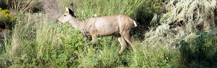 Aber wie ich schon mal sagte: Diese Fehler haben wir zum Beginn mit ziemlicher Sicherheit auch gemacht. Kurz vor Ende des Trails kommt uns eine Rangerin entgegen und erkundigt sich, wie der West Rim Trail war. Anhand der Backpacks war ihr natürlich sofort klar, dass wir nicht Angel' s Landing gemacht haben. Anita erzählt ihr von unserer Entdeckung und ich zeige ihr die Bilder. Sie bestätigt Mrs. Quincys Tatvermutung als eine Möglichkeit, wirft aber auch einen anderen Hergang in die Runde: Das Deer ist gestürzt und dabei zu Tode gekommen und andere Tiere haben sich über den Kadaver hergemacht. So gehen wir also mit zwei Lösungsmöglichkeiten weiter und erreichen nach 5 Meilen am heutigen Tag Grotto, das Ende des Trails und gleichzeitig Shuttle-Station. Mit dem Shuttle