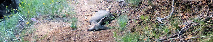 Ein "Deer", was bei uns einem Reh in etwas entspricht, liegt regungslos unmittelbar vor uns. Da es keinen anderen Weg gibt kommen nicht umhin, uns zu nähern. Und je näher wir kommen, desto grausamer wird der Fund: Was man von dieser Seite aus nicht erkennen kann und ich auch nicht veröffentlichen werde ist, dass im hinteren Bereich weite Teile offen liegen. Wir gehen stumm vorbei und sehen uns das ganze lediglich im Augenwinkel an, und das lässt uns schon gruseln und ekeln, zumindest mich. Zunächst gehen wir