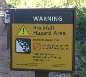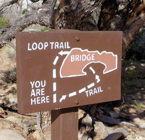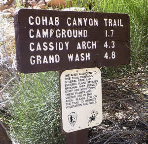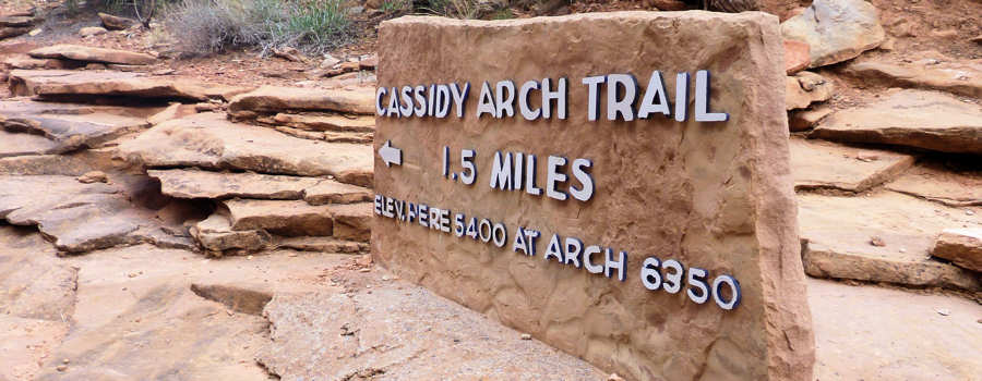 Der Weg soll nur 1,7 Meilen lang sein (eine Richtung) aber 205 Meter Aufstieg erfordern. Wir starten gut ausgerüstet. Die ersten 0,3 Meilen führen durch die Wash, bevor uns dann ein Wegweiser aus der Wash in Richtung Cassidy Arch leitet.