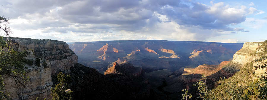 04.05.2015: Die Nacht war wie befürchtet: Uns beiden schmerzt der Rücken, wir haben wenig geschlafen und uns von einer auf die andere Seite gedreht. Der Sandboden wirkt anders als erwartet: Jede Sandkuhle und jede Sandbeule gehen direkt auf die Knochen. Das Zelt bauen wir mal wieder in aller Frühe auf, aber ganz leise, um die anderen Camper nicht zu wecken. Doch mit dem Sonnenaufgang kommt in einigen Zelten Leben auf: Viele verlassen ihr Häuschen um das Aufgehen der Sonne mitzuerleben. ![]() Leider zeigt sich die Sonne nur ganz kurz hinter dem Horizont, bevor sie sogleich wieder hinter den Wolken verschwindet, und von unserer Perspektive aus auch noch direkt hinter einem Monolithen verschwindet. Von daher: Beim nächsten Mal lieber eine Campsite mit einer höheren Nummer wählen. Aber wir werden uns das noch überlegen, ob wir hier nochmals campieren, weniger wegen der aus unserer Sicht ziemlich überzogenen Preisen als vielmehr wegen des Untergrundes. Unser Weg führt uns heute über Kayenta (Frühstück) und Cameron (Tankstopp) zum Grand Canyon. ![]() ![]() Geplant haben wir diesmal erneut einen Hike below Rim, auch wenn einige Freunde von uns nur den Kopf schütteln und fragen, weshalb wir denn immer wieder hier her kommen. Die ins Auge gefasste Tour soll uns vom South Kaibab Trail hinunter führen bis zum Tipoff-Point auf dem mittleren Plateau im Canyon. Von hier aus geht es dann über den Tonto-Trail "relativ eben" bis zu Indian Garden, von wo aus wir dann am nächsten Tag über den Bright Angel Trail nach oben zum Rim gehen. Für heute haben wir eine Cabin gemietet, wieder einmal eine "Partiell View and Fireplace", also mit teilweisem Blick in den Canyon und einem offenen Kamin. Check-In-Time ist eigentlich 16UIhr aber um kurz nach 15Uhr probieren wir schon mal unser Glück und siehe da, unsere Cabin ist bereits bezugsfertig. ![]() Wir sind richtig begeistert: Die Cabin ist größer als unsere bisherigen, der Blick in den Canyon hervorragend, so dass wir rundum zufrieden sind. ![]() Unsere Backpacks für die morgige Tour haben wir ausnahmsweise schon vorhin in der Nähe des Backcountry-Schalters gepackt, als wir uns dort nach dem Wetter für die nächsten Tage erkundigt haben. Das wiederum soll, zu unserer Überraschung ziemlich kalt und nass werden. Mit einer Regenwahrscheinlichkeit von über 50% und Tagestiefsttemperaturen um den Gefrierpunkt auf dem Rim haben wir alles eingepackt, was uns Wärme und Trockenheit spenden könnte: Ponchos, Regenjacken, Fleece und Thermohemden. Das bedeutet natürlich Gewicht, aber immerhin ist die Wasserleitung intakt und somit Wasser auf Indian Garden garantiert. Das bedeutet pro Person nur drei Liter statt sechs Liter Wasser und damit 3 gesparte Kilo. Da die Backpacks fast fertig gepackt sind hält sich der Arbeitsaufwand in Grenzen und wir können die Cabin und den offenen Kamin wirklich mal genießen. Wermutstropfen ist, dass unser Canyon Cafe am Market Plaza derzeit renoviert wird, so dass unser traditionelles Abendessen dort ausfallen wird. Stattdessen haben wir im dortigen Supermarkt neben dem Proviant für morgen noch einen kleinen Snack eingekauft, den wir jetzt genüsslich kauen. Und dann geht es schon ins Bett, mit dem Blick in den Canyon, dem heute aber leider kein toller Sonnenuntergang gegönnt ist. ![]() So, nun aber schnell schlafen, gute Nacht ! |
