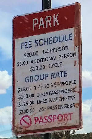 Der Eintrittspreis, der zu bezahlen ist, ob man nun zum Hotel, zum Campground, in die Loop oder einfach nur zum Gucken möchte, ist auf $20 pro Auto für 1 bis 4 Personen gestiegen. Wir sind doch überrascht. Angefangen haben wir mal mit $3 pro Person über $5 bis letztlich vor zwei Jahren $6 . Jetzt sind $20 fällig, obwohl wir nur zu zweit
