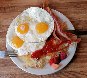 beim Frühstück im Restaurant des Motels.