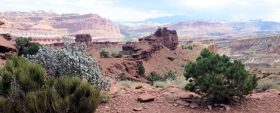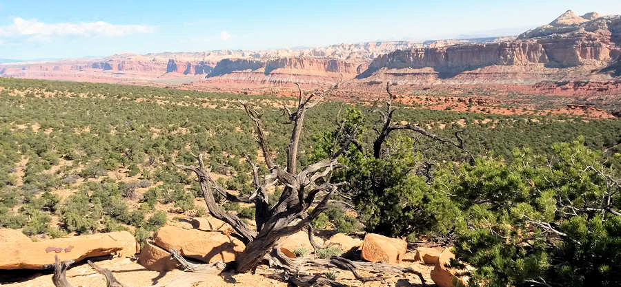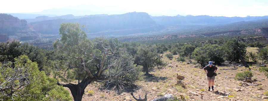 08.Sept. 2015: Nach dem üblichen Prozedere befinden wir uns um 8Uhr am Trailhead zum Old Wagon Trail, nachdem wir vorsichtshalber wegen der RR doch noch bis zum Ende des Scenic Drives gefahren waren. Wir rätseln noch, ob wir die Jacken anziehen oder zumindest mitnehmen sollen, denn es ist zwar etwas frisch aber nicht richtig kalt und die Sonne scheint bald schon vom wolkenlosen Himmel auf den Trail zu scheinen. Wir entscheiden uns für Mitnehmen: Ja! ; Anziehen: Nein ! Zunächst geht es zwei drei Meter steil nach unten und von dort aus kontinuierlich nach oben. 3,8Meilen soll er nur lang sein, einen Höhenunterschied vom tiefsten zum höchsten Punkt ca. 320 Meter und wird als anstrengend klassifiziert. Wir protzen für Optimismus und Neugierde, sehen wir den gestrigen Trail trotz der selben Klassifizierung über weite Strecken eher als moderate wenn nicht gar easy. Zumal der Trail lt. Kurzbeschreibung durch Pinienwälder führt, also uns Schatten verspricht. Nun ist es aber so, dass sich die Ranger bei der Klassifizierung vermutlich stets was dabei denken und sie manchmal sehr stimmig ist. Einerseits werden wir schnell daran erinnert, dass die Pinienwälder zumindest im Südwesten der USA sich dadurch auszeichnen, dass die Bäume gerade mal mannshoch oder etwas mehr sind und so dick und wuchtig gewachsen dass man sich kaum drunterstellen kann. Allenfalls ein Kauern dicht am Stamm ist bis auf wenige Ausnahmen möglich. Von daher entfällt schon mal der Luxus eines schattenreiches Trails. Und dann geht er doch recht steil nach oben. Wir müssen feststellen: Der Trail ist anstrengend! Der Trail geht zunächst 1,4km steil nach oben, bis sich daran eine Loop anschließt, die wir im Uhrzeigersinn folgen. Und bis zur Mitte der Loop steigt der Trail weiterhin recht steil an. Den Trail zeichnet eine ganze Reihe von Dinge aus: 1.) Absolute Einsamkeit: Kein anderer Hiker stört unsere Kreise => wir lieben es ! 2.) Der Trail ist nur durch Steinmännchen gekennzeichnet und führt über viel Geröll => wie lieben es überhaupt nicht! ![]() Tatsächlich ist der Weg durch ganz viele Steinmännchen gut gekennzeichnet und dadurch lässt er sich schnell immer wieder finden, wenn man mal vom rechten Weg abgekommen ist. Im Dunkeln hingegen ohne entsprechende Taschenlampen ist er prädestiniert, um sich fürchterlich zu verlaufen. Und von ein oder zwei Passagen abgesehen, bei dem der Weg gut ausgetreten und einfach zu laufen ist, ist er komplett steinig und erfordert immer wieder genau hinzusehen, wo man hintritt. ![]() Immer wieder kontrolliere ich mit dem GPS-Gerät, wie hoch es denn wohl noch gehen wird. Der Trail hat sich nämlich etwas ganz hinterlistiges ausgedacht. Immer wieder kommen kleine Anstiege, an deren Ende man den Höhepunkt des Trails vermutet, und wo man eines Besseren belehrt wird, sobald man diesen Punkt erreicht. Das klingt vielleicht alles dramatischer als der Trail tatsächlich ist und mit Sicherheit haben wir schon anspruchsvollerer und vor allem längere Trails absolviert, dennoch müssen wir darauf achten, nicht auf die eigenen Zungen zu treten, weil wir so hecheln und schnaufen. Na ja, das ist jetzt auch übertrieben aber zumindest spielen wir in dieser Phase beide mit dem Gedanken, unsere zweitägige Trekkingtour zum Kolob Arch im Zion am Ende der Woche sein zu lassen. Doch dann plötzlich scheinen wir in der Mitte der Loop den Scheitelpunkt zu erreichen und der Weg führt wieder etwas nach unten. Und schon sind alle Energien wieder aufgeladen. Ein Holzpfosten mit zwei Pfeilen verrät uns, dass der Trail nun in einer anderen Richtung weiter in Richtung Trailhead führen wird. Zunächst geht es ebenso steil wie vorhin hoch nun runter und schon verrät uns ein weiterer Pfosten, dass es hier einen Viewpoint gibt, den wir mit etwas Klettern licht erreichen. ![]() Der Blick von hier oben entlohnt uns auf jeden Fall für die bisherige Anstrengung. Ganz weit in der Ferne scheint man den Parkplatz am Ende des Scenic Drives erkennen zu können, ansonsten sehen wir bei einem 360Grad Schwenk nichts, was nach moderner Zivilisation aussieht. ![]() Hier würden wir am liebsten stundenlang pausieren und diesen Anblick für ein lebenslang auf der inneren Festplatte abspeichern. Aber der große Planet am Himmel stört ein wenig. Hier oben auf dem Felsplateau gibt es keinerlei Schatten und daher führen wir unseren Hike nach nur 5 Minuten Pause weiter. Es geht weiter bergab und bald schon erreichen wir die Stelle, an der die Loop begann und nun für uns endet. Wir stellen fest, dass der Trail auf dem Stück, der vom Trailhead bis zur Loop führt, besser zu begehen isst als in der Loop. Nach 2Stunden und 50Minuten stehen wir wieder am Wagen und freuen uns auf die kalten Getränke darin. Unsere Bewertung dieses Trails: Frühes Losgehen ist zumindest im Sommer dringend zu empfehlen bevor die Sonne in Fahrt kommt. Der Trail ist einsam, wie wir es bevorzugen. Und der Ausblick vom Viewpoint aus entschädigt, wie bereits erwähnt, für die anfängliche Anstrengung. Der Rest des Tages gestaltet sich so angenehm als hätten wir Urlaub, um diese Erkenntnis mal wieder zu erwähnen: Wir fahren zu einer der verschiedenen Picknick-Areas hier und genießen im Schatten eines großen Baumes, der größer als die Pinien ist, den Tag: Die Tasten des Laptops werden strapaziert und ebenso unsere Gedanken, was wir denn jetzt mit unserer Trekkingtour machen. Denn so sehr wir das Trekken auch lieben, es ist leider aufgrund der großen und vor allem schweren Backpacks niemals ein "easy walk". Nach langem Überlegen und Abwägen kommen wir zum Schluss, dass wir bei unserer ursprünglichen Planung wohl bleiben werden. Ob wir dann von unserer Campsite aus wirklich bis zum Kolob-Arch gehen werden, das sehen wir ja dann noch. Aber zunächst bleibt es bei der ursprünglichen Planung. Nach dem Picknick, das mangels Essen nur bei kalten Getränken bleibt, fahren wir für ein paar Fotos, die wir noch benötigen, noch etwas durch d