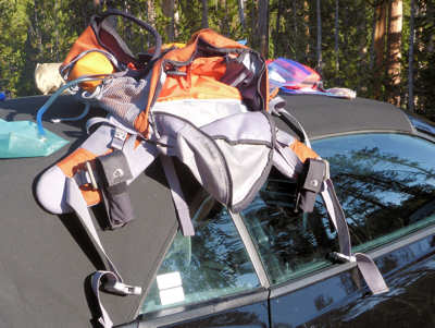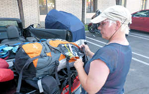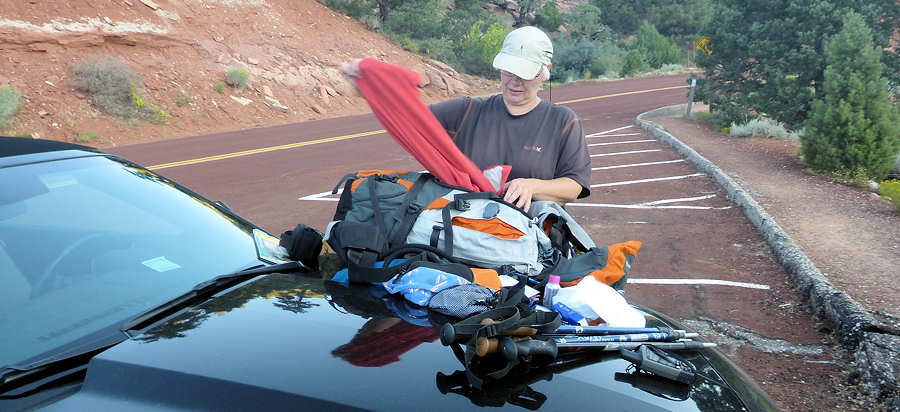 Nach kurzer Zeit parken wir den Wagen auf dem Parkplatz, gegenüber des Trailheads. Unser Start verzögert sich leider zwangsläufig, denn wir müssen feststellen, dass der Kofferraum recht feucht ist. Und nicht nur der: Auch die Rucksäcke und einiges andere Equipment. Die Ursache ist schnell gefunden: Die Wasserblase in meinem Rucksack war nicht fest genug zugedreht und es ist gibt keine Möglichkeit, Anita dafür verantwortlich zu machen. Schließlich habe ICH die Blase zugedreht. Obwohl es noch sehr früh ist hat die aufgehende Sonne schon genügend Kraft, den Teppich des Kofferraums und unser Equipment in gut 15 Minuten zu trocknen.