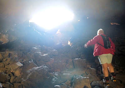 Vor zwei Jahren haben wir diesen Park kennengelernt, im letzten Jahr mussten wir unsere Tour durch die Höhlen aufgrund des Wetters ausfallen lassen und heute verspricht der wolkenlose Himmel, dass wir wieder hindurchklettern können. Wir benötigen eine Permit und hierzu müssen wir einige Fragen beantworten: z.B., ob wir in den letzten zehn Jahren in irgendeiner Höhle westlich von hier waren, ob wir heute das selbe Schuhwerk tragen und ob wir unsere Brillen und Kameras auch damals dabei hatten. Wir beantworten alle Fragen selbstverständlich ordnungsgemäß, auch auf die Gefahr, dass wir keine Permit erhalten. Der Hintergrund dieser Vorsichtsmaßnahme ist, dass es seit etwa zehn Jahren zu einem ausgeprägten Fledermaussterben kommt, was auf einen Virus zurückgeführt wird, der die sog. White-Nose-Deseas, der sich im Westen ausbreitet. Wir erhalten die Permit und gehen einen längeren asphaltierten Weg zum Indian Tunnel. Hier steigen wir über eine Eisentreppe hinab in die sehr große Höhle. Genau genommen ist es gar keine richtige Höhle, da es immer wieder große Löcher in der Decke gibt. Obwohl man im ersten Abschnitt über ein paar Steine klettern muss, sich gelegentlich den besten Weg zu bahnen hat und man letztlich nach etwa 300 Meter durch eine kleine Öffnung schlüpfen muss, ist diese kurze Tour zu empfehlen.