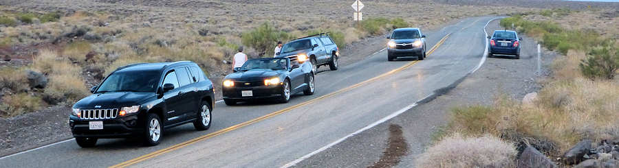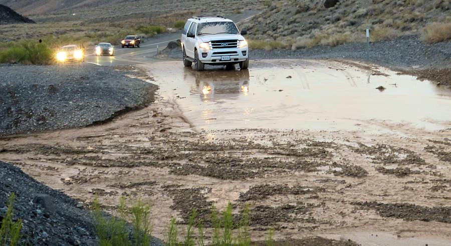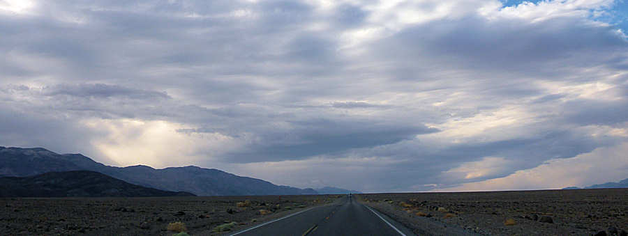 12.September 2015: Da ich gerne ein paar Fotos vom Sonnenaufgang machen möchte entpuppt sich der Abbau unseres Zeltes als recht entspannt. Während die Kamera vor sich hersaust bauen wir das Zelt ab, führen eine Equipmentpflege durch und verstauen alles in den diesmal fast ungenutzten großen Trekkingrucksäcken. Da wir für das nächste Mal schon einen vorläufigen Plan haben packen wir die Rucksäcke entsprechend. Um 9Uhr etwa verlassen wir die Campsite, in Hurricane gibt es ein kleines Frühstück bei Mc.Donald´s und in Vegas verstauen wir die Rucksäcke im Storage. In Pharump kaufen wir noch ein paar Kleinigkeiten beim Walmart und irgendwann zwischen 16:00Uhr und 17:00Uhr erreichen wir nach einem kurzen Stopp im Visitor Center ![]() (121 Grad Fahrenheit = knapp 50Grad Celsius) StovepipeWells, wo wir uns wieder für drei Nächte bei den Roadrunnern einquartieren. Kurz hinter Las Vegas haben wir schon große, massivaussehende Wolkentürme gesehen, die sich bis ins Death Valley reingezogen haben und tatsächlich, in der Lobby lesen wir, dass mit Regen und ggf. Unwetter gerechnet wird. Insbesondere der morgige Sonntag hat Gefahrenpotenzial. Der darauffolgende Montag soll auch noch ein paar Wolken bringen und ab Dienstag wird es dann wieder schön. Nett zu lesen ist ein Hinweis an der Rezeption. Ein Käfer, der derzeit in Death Valley überall anzufinden ist und ganz viele Brüder und Schwestern hat, wird sicherlich auch in unserem Zimmer anzufinden sein. Der Housekeeping bemüht sich intensiv, die Käfer aus den Zimmern fernzuhalten, was aber ein ziemliches Unterfangen ist. Man bittet um Verständnis, dass nicht mehr dagegen gemacht werden kann, weil das Sprühen von Gift hier im National Park verboten ist. Dafür können wir aber beruhigt sein, denn der Käfer und all seine Brüder und Schwestern sind völlig harmlos. Diese Ankündigung finden wir sehr geglückt: Wir wissen, dass die Käfer harmlos sind und wir einfach mit ihnen leben müssen und können. Übrigens müssen wir die Geschichte vom Tanken in Death Valley umschreiben: Bisher war der Sprit in Stovepipe Wells stets deutlich billiger als in Furnace Creek, meist um die 60 Cent pro Gallone. Und jetzt müssen wir feststellen, dass es erstmalig umgekehrt sind: In Furnace Creek kostet Regular $3,61/Gal und in Stovepipe Wells $4,22/Gal. Erklär uns doch bitte einer die Welt ! Kurz nach dem Beziehen des Zimmers geht es ins 30 Meilen entfernte Panamint um dort den fantastischen Bluecheeseburger zu genießen. Ohne vorher nacch der Karte zu fragen bestellen wir ihn für mich, während Anita wieder ihren PettyMelt ordert. Die Bedienung äußert, sich an Anita erinnern zu können. Damit steht für mich fest, dass ich mich beim letzten Mal wohl besser benommen haben muss als sie! Auf der Terrasse sitzend genießen wir das leckere Essen, die kalte Cola und die angenehm warme Luft. Im Hintergrund entwickelt sich in einiger Entfernung ein kräftiges Gewitter mit Regen und angsteinflößenden Blitzen. Unserer Bedienung gibt Anita den Tip, sich neben mich zu setzen, damit wir gemeinsam das Spektakel beobachten können. ![]() Nach knapp einer Stunde verabschieden wir uns und ich weise schon einmal daraufhin, dass ich für morgen gerne einen weiteren Bluecheeseburger reservieren möchte. Etwa in der Mitte der Rückfahrt kommt uns ein Wagen entgegen, der mit Lichthupe und Handzeichen und mahnt, langsam zu fahren. Und tatsächlich gibt es wenige Kurven später einen kleinen Stau und viele Wagen mit Warnblinkanlage. ![]() Ein kleine Flashflood ergießt sich über die Straße, die aber dennoch so stark ist, dass sich zunächst niemand traut, hindurchzufahren. ![]() ![]() Nach etwa 20 Minuten durchqueren die ersten Mutigen ganz vorsichtig den matschigen und ausgespülten Untergrund. Einer der ersten Fahrzeuge ist übrigens ein sog. "Erlkönig", als eine Neuentwicklung, die noch nicht der Öffentlichkeit vorgestellt ist und hier zur Unkenntlichkeit verkleidet Testfahren vornimmt. Wir malen uns gerade aus, wie die Konzernleitung toben würde, wenn ausgerechnet einer ihrer Erlkönige hängen bliebe. Aber alles geht gut. Und irgendwann reift auch in mir der Mut und ich übernehme das Steuer des Wagens. Mit einem SUV hätte ich überhaupt keine Bedenken gehabt aber mit einer solchen Flunder ohne Allradantrieb bleibt nur: "Mit Schwung hinein und auf der anderen Seite hoffentlich wieder raus". Und es klappt, auch wenn unser Camaro ein völlig neues Bild abgibt. Danach geht es nur noch zum Nachtschwimmen an den Pool, bevor wir dann am späten Abend gegen 10Uhr mal im Zimmer verschwinden. Allerdings müssen wir vorher dafür Sorge tragen, dass wir im Zimmer keinen ungebetenen Besuch bekommen. Denn eine handtellegroße Tarantel versucht am Fenster entlang Einlass in unser Zimmer zu finden, was wir grundsätzlich ablehnen. ![]() Also dann, wieder einmal "Gute Nacht!" |